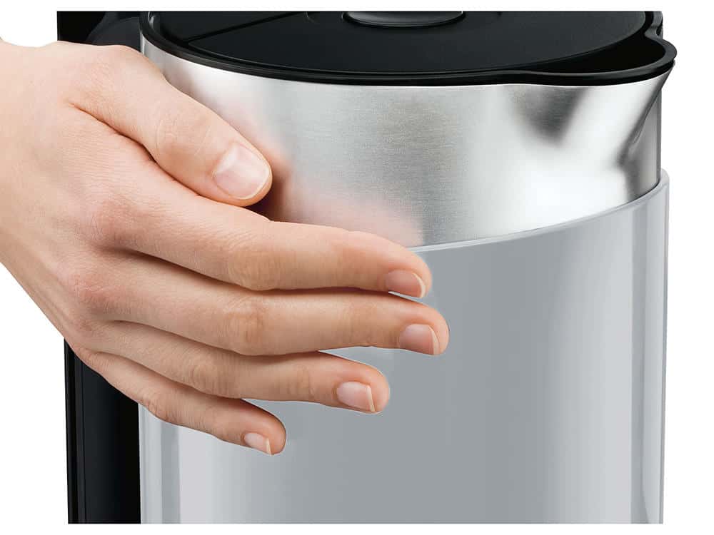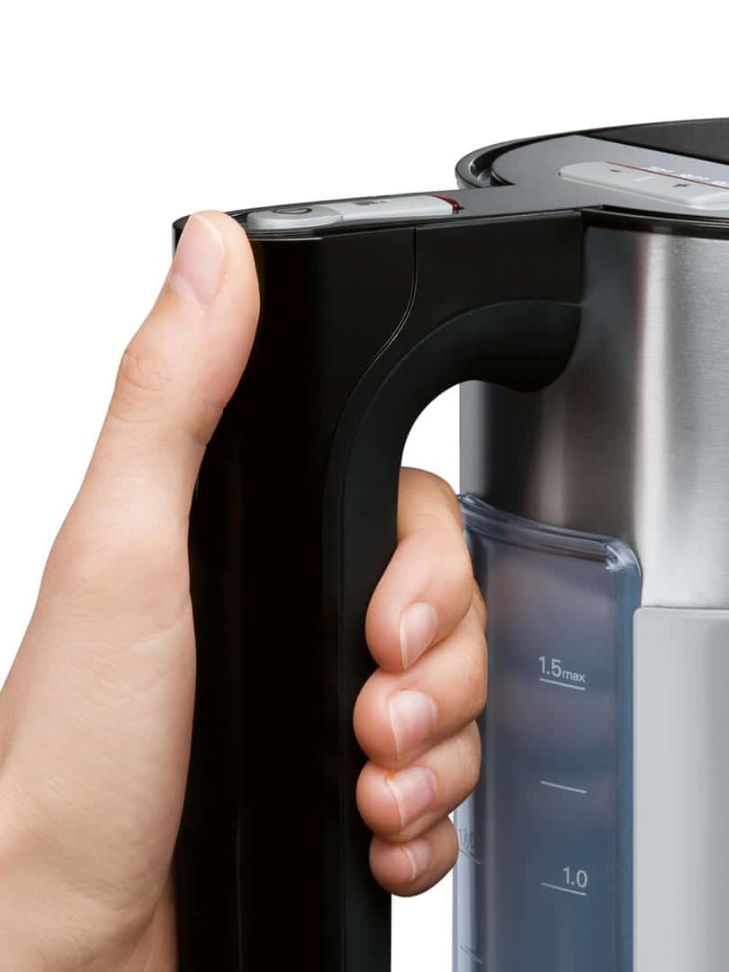 Với ấm đun nước Siemens TW86105P, bạn có mọi thứ trong tầm kiểm soát. Nó gây ấn tượng với thao tác rất đơn giản và sự tiện lợi tuyệt vời: nút tích hợp trên tay cầm sẽ tự động mở nắp và cho phép đổ đầy thiết bị một cách nhanh chóng và dễ dàng.