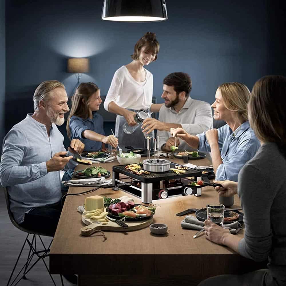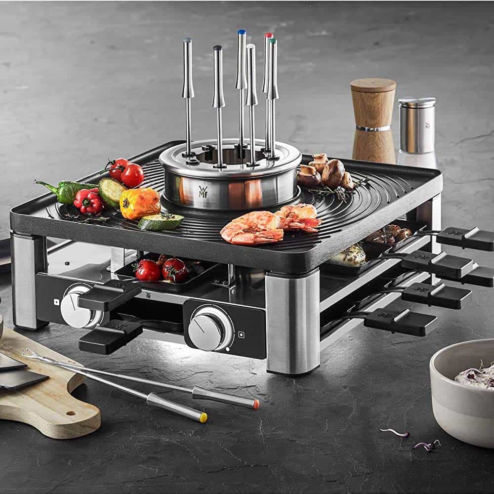 Nhờ điều khiển nhiệt độ riêng biệt, các chức năng raclette và fondue của bếp nướng điện WMF có thể được sử dụng song song để nấu nướng tiết kiệm thời gian và năng lượng. Raclette bao gồm 8 chảo chống dính có thanh trượt. Nó có thể được điều khiển thông qua bộ điều khiển nhiệt độ và có giới hạn tối đa. Công suất tỏa nhiệt 1100 watt. Chảo nóng có thể đặt trong kệ trong giờ nghỉ giữa bữa.