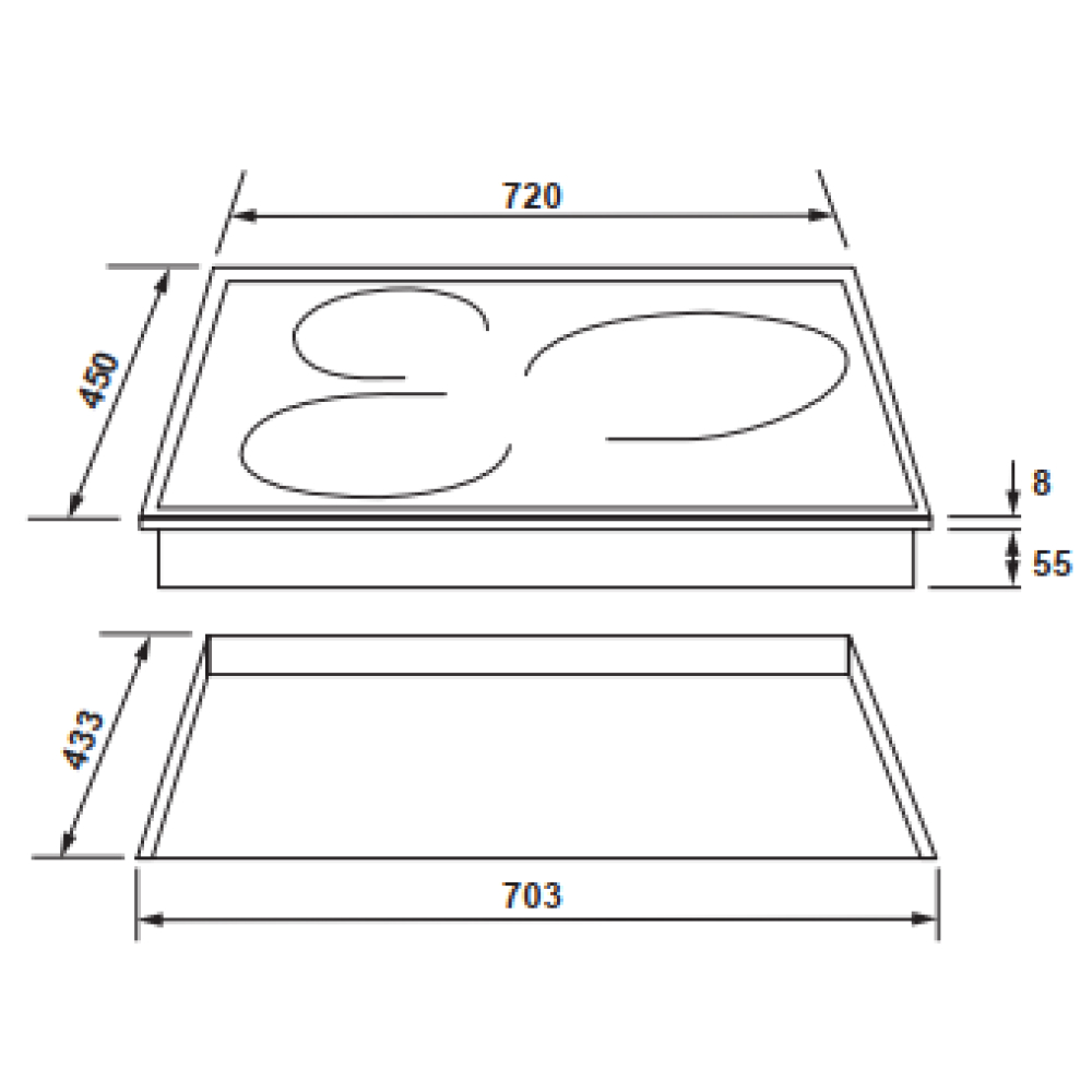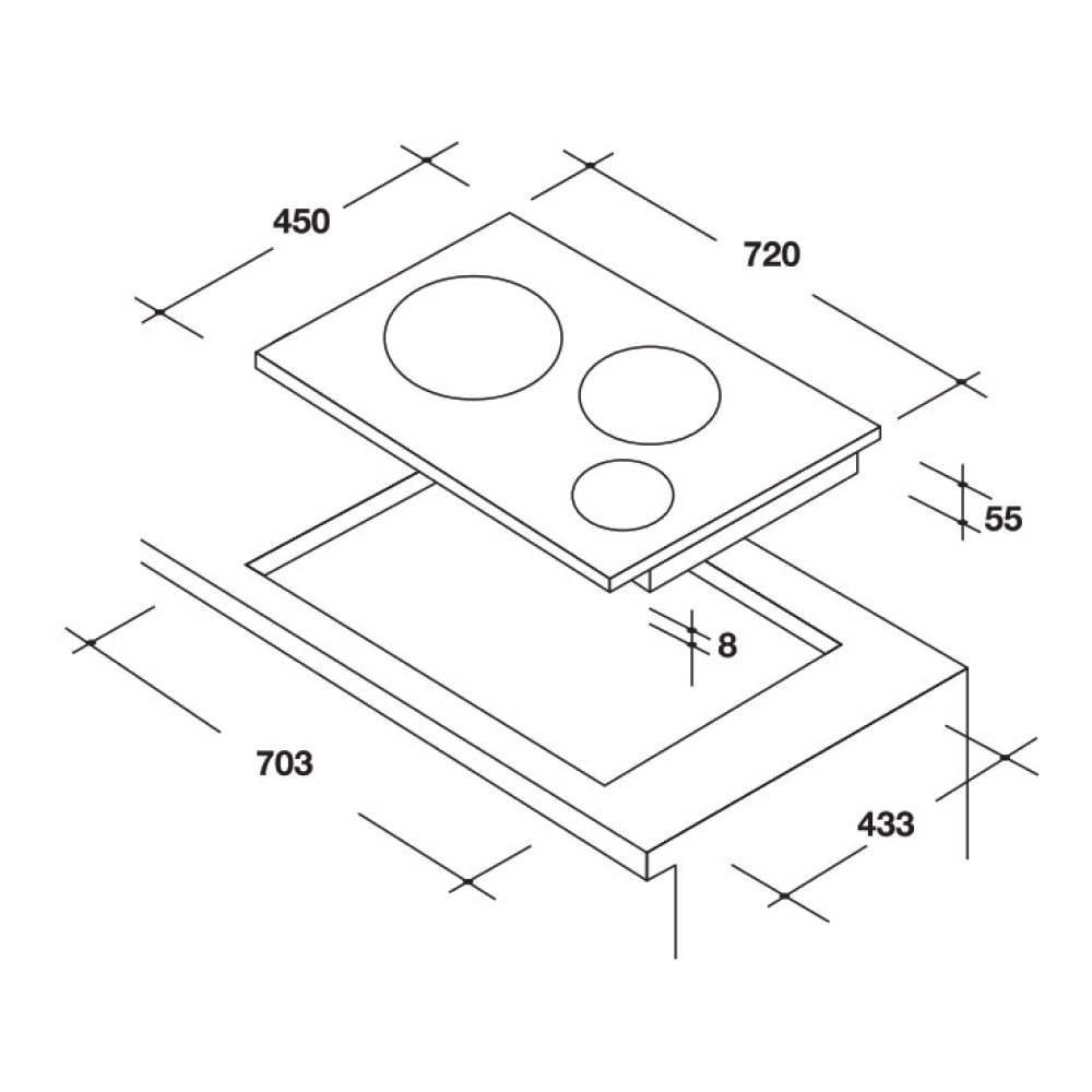Dưới đây là thông số lắp đặt của bếp từ hồng ngoại 3 vùng nấu Rosières PMI732N 6100W.