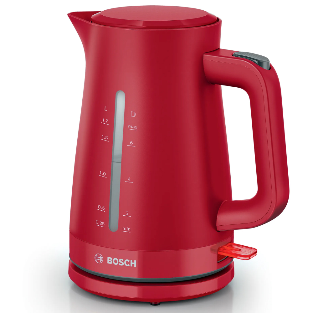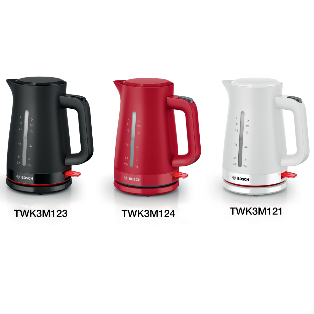 Bình đun siêu tốc Bosch TWK3M MyMoment được thiết kế với 3 màu sắc tinh tế bao gồm trắng (TWK3M121), đen (TWK3M123) và đỏ (TWK3M124), dễ dàng phối hợp với mọi phong cách nội thất, tạo điểm nhấn cho căn bếp nhà bạn. Ngoại thất được làm từ nhựa cao cấp tối giản các chi tiết, tạo nên tổng thể hiện đại và sang trọng.