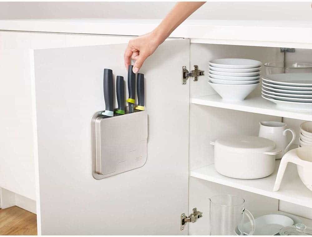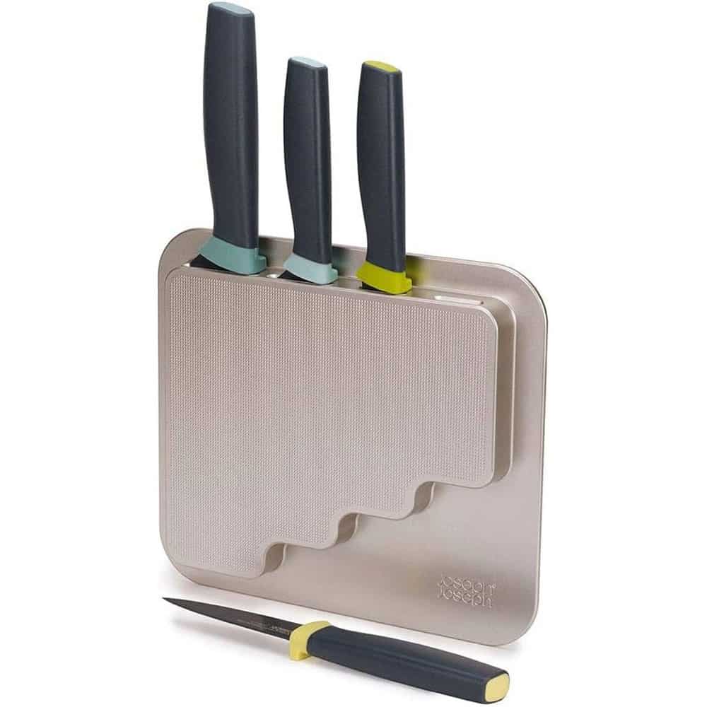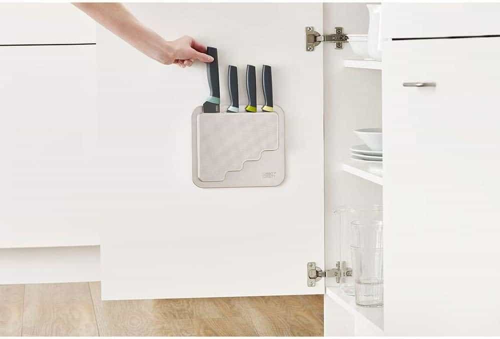 Bộ dao làm bếp 4 món Joseph Joseph DoorStore 10303 không chỉ thiết kế sáng tạo ở dao mà còn sáng tạo một hộp đựng có đường viền mỏng, tiện ích là lý tưởng để cất giữ trong các ngăn tủ, cánh tủ bên trong. Các loại dao của Joseph Joseph có lưỡi thép không gỉ, được tráng silicone và tích hợp bệ đỡ dụng cụ giúp tận dụng tối đa không gian bên trong tủ của bạn bằng cách cất ở mặt sau của cánh cửa hoặc trên tường.
