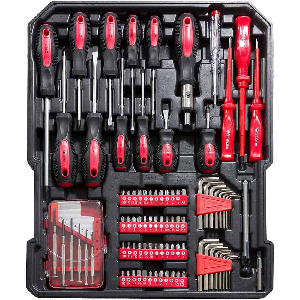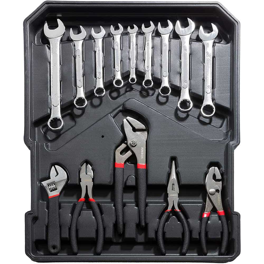 Hộp công cụ AREBOS của chúng tôi với 1200 công cụ chất lượng cao được thiết kế tối ưu để sử dụng trong nhà, ga ra hoặc xưởng. Các công cụ này lý tưởng cho cả người không chuyên và thợ chuyên nghiệp. Bao gồm tất cả các công cụ tiêu chuẩn phổ biến, chẳng hạn như búa, cờ lê, tuốc nơ vít và các loại kìm khác nhau. Các dụng cụ khác đi kèm như dây buộc, găng tay, súng bắn keo, băng keo cách điện.