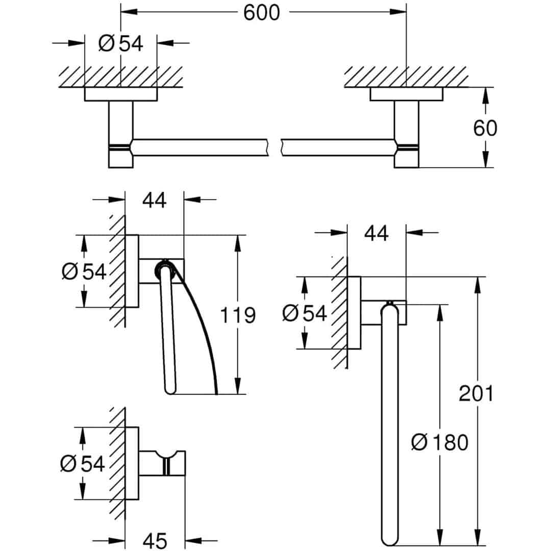 - Bộ sản phẩm bao gồm thanh treo khăn, móc áo choàng, hộp chứa khăn giấy và vòng quấn khăn