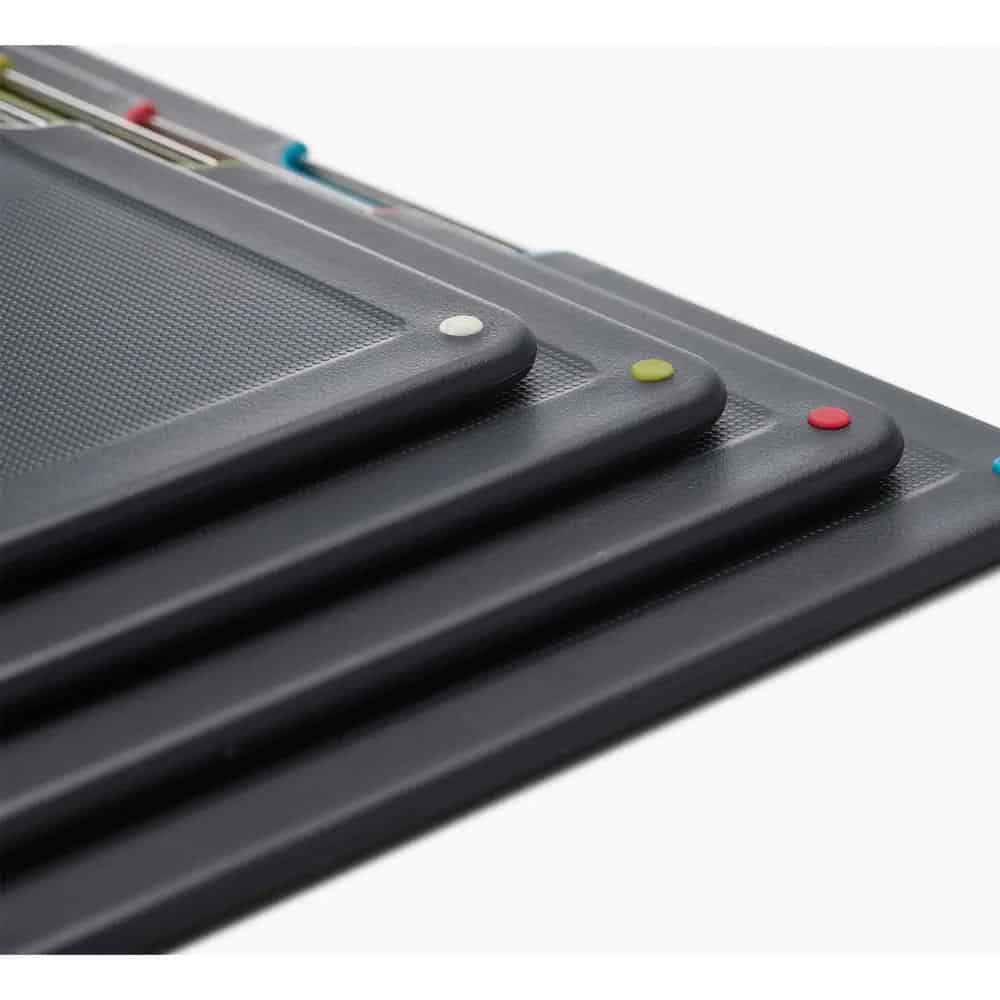 Bộ 4 Thớt Joseph Joseph Folio bao gồm 4 góc có đánh dấu các màu sắc để bạn phân biệt và sử dụng cho các loại thực phẩm khác nhau, có thể được cất giữ ngăn nắp đẹp mắt trong hộp đựng có đường viền mỏng đẹp mắt của chúng. Thiết kế theo tầng và các thanh thép không gỉ trên bảng để dễ dàng lựa chọn. Chân đế giữ các bảng cách xa nhau để không khí có thể lưu thông