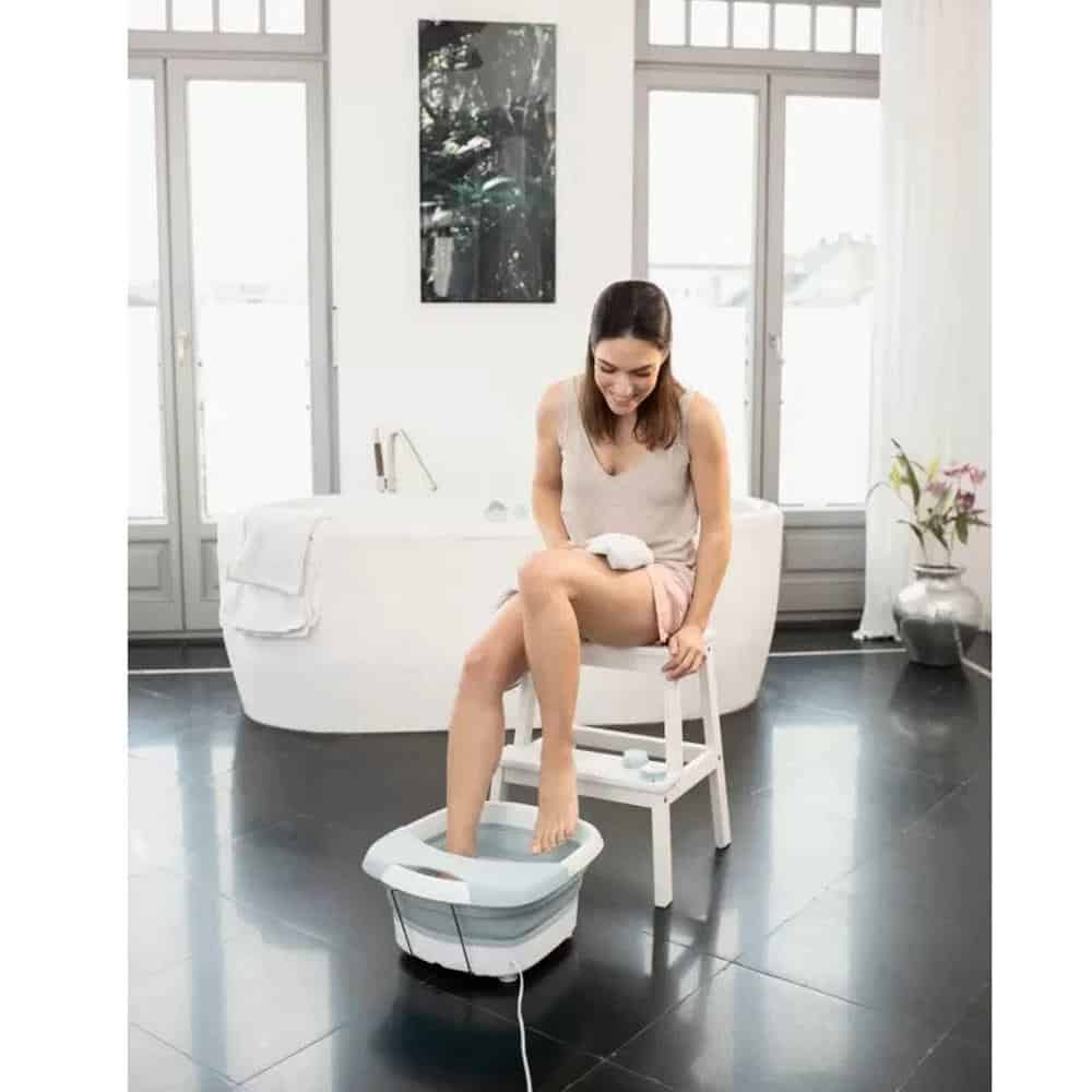 Chức năng bong bóng mạnh mẽ đảm bảo lưu thông máu và tái tạo bàn chân căng thẳng. Đồng thời, các vùng phản xạ bàn chân có thể được xoa bóp với sự trợ giúp của sáu con lăn massage ở giữa thiết bị và các cơ căng thẳng có thể được thả lỏng. Con lăn massage ở khu vực trung tâm của bồn tạo sóng bàn chân để xoa bóp mặt dưới của bàn chân.