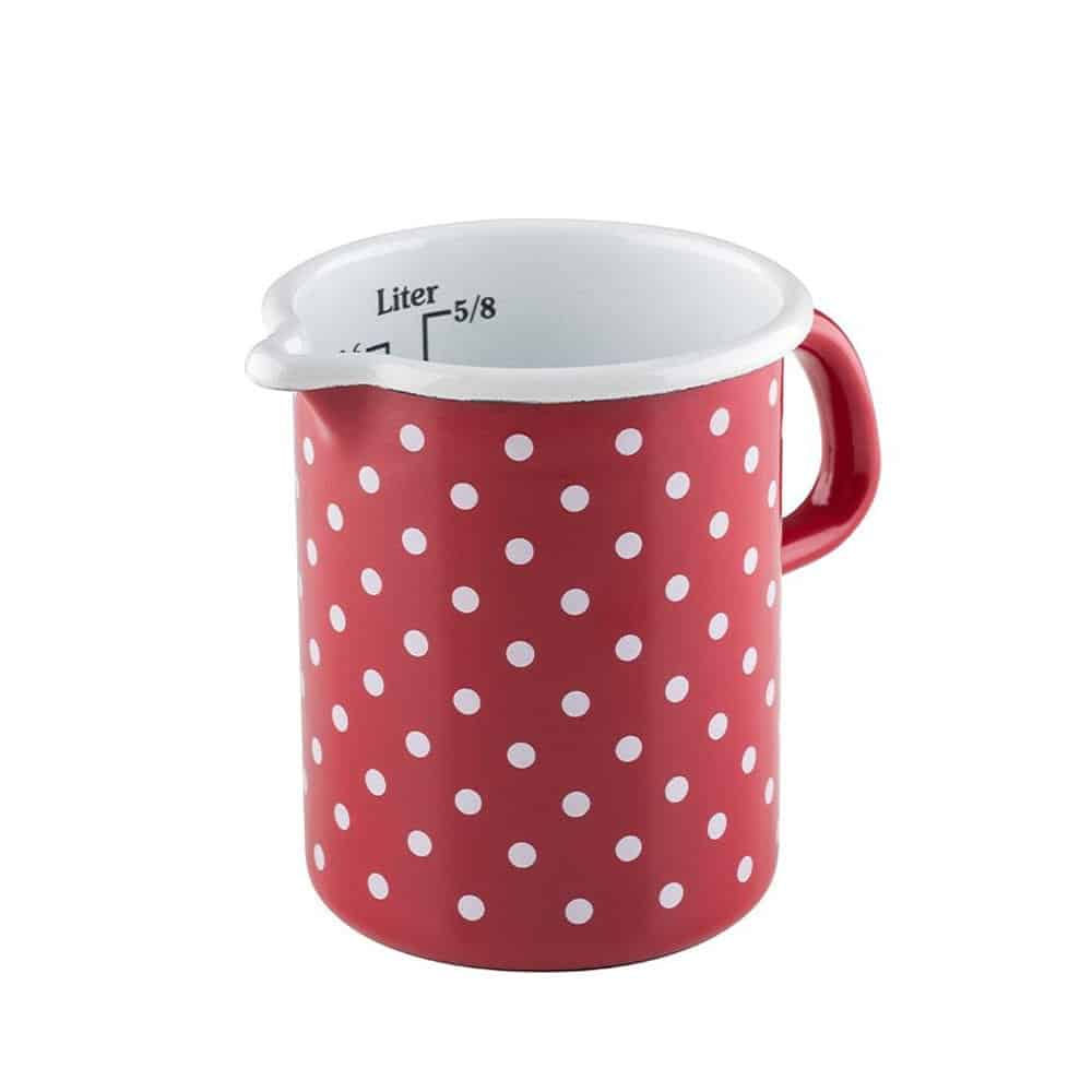 Ca Riess Country 0.5L Spot Red với hai kiểu dáng khác nhau nhưng cùng một dung tích có thiết kế vòi đặc trưng giúp rót các chất lỏng như sữa, nước, súp và nước sốt mà không bị vương vãi một giọt nào. Với tay cầm tròn, những chiếc ca này của Riess lý tưởng để phục vụ trực tiếp tại bàn. Vành cong được tạo ra bằng cách uốn cong kim loại trong quá trình sản xuất tạo ra sự ổn định cho sản phẩm. Ca Riess Country Spot Red được ưa chuộng và là một trợ thủ đắc lực trong mọi căn bếp. Riêng mã ca Riess 0337-077 có thang đo dung tích bên trong giúp bạn dễ dàng hơn trong việc định lượng thức uống.