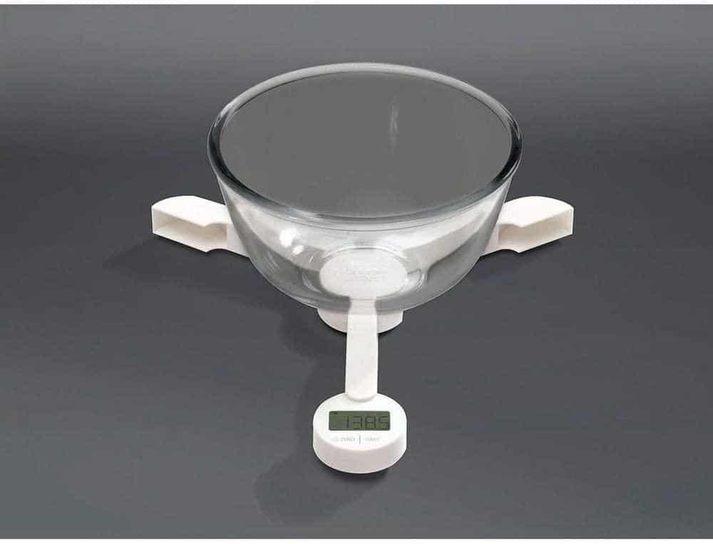 Khi mở, ba cánh tay của cân điện tử cung cấp một nền tảng ổn định để đặt bát và các vật dụng khác lên để cân.