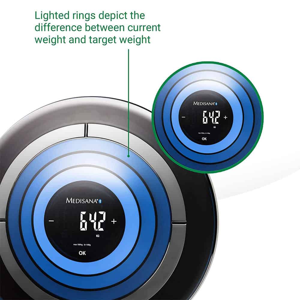 Các vòng ánh sáng LED: Nhờ chức năng mục tiêu, trình tự của các kích thích có thể nhìn thấy ngay từ cái nhìn đầu tiên. Ba vòng được chiếu sáng trong cân điện tử Medisana cung cấp khả năng kiểm soát trực quan: Vòng được chiếu sáng càng gần tâm, trọng lượng mục tiêu càng gần