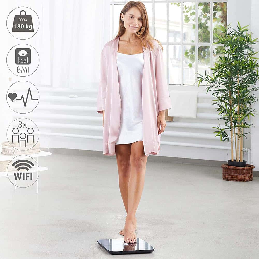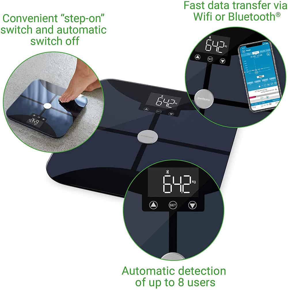 Để thuận tiện hơn, màn hình kết nối WiFi Medisana được trang bị các điện cực ITO chất lượng cao và vô hình. Với mỗi phép đo cân nặng, Cân điện tử Medisana BS 652 cũng thực hiện phép đo nhịp tim. Cân cũng có khả năng tự động nhận diện tối đa tám người dùng khác nhau.