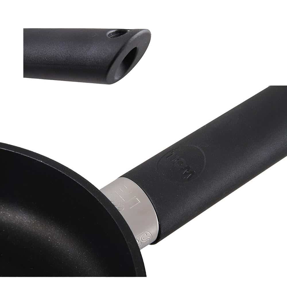 Với tiêu chí sử dụng các vật liệu thân thiện với môi trường, phần tay cầm của Chảo Gang Woll Eco Lite Saute 724ELI được sản xuất bằng các vật liệu tái chế được. Tay cầm đảm bảo cách nhiệt hiệu quả trong suốt quá trình nấu ăn. Ngoài ra, chảo được thiết kế có thể sử dụng trong lò nướng với nhiệt độ taycầm có thể chịu được lên đến 2200C. Nhà sản xuất còn thiết kế thêm 1 lỗ tròn nhỏ ở phần cuối tay cầm giúp cho việc cất giữ trên các giá treo rất tiện lợi.