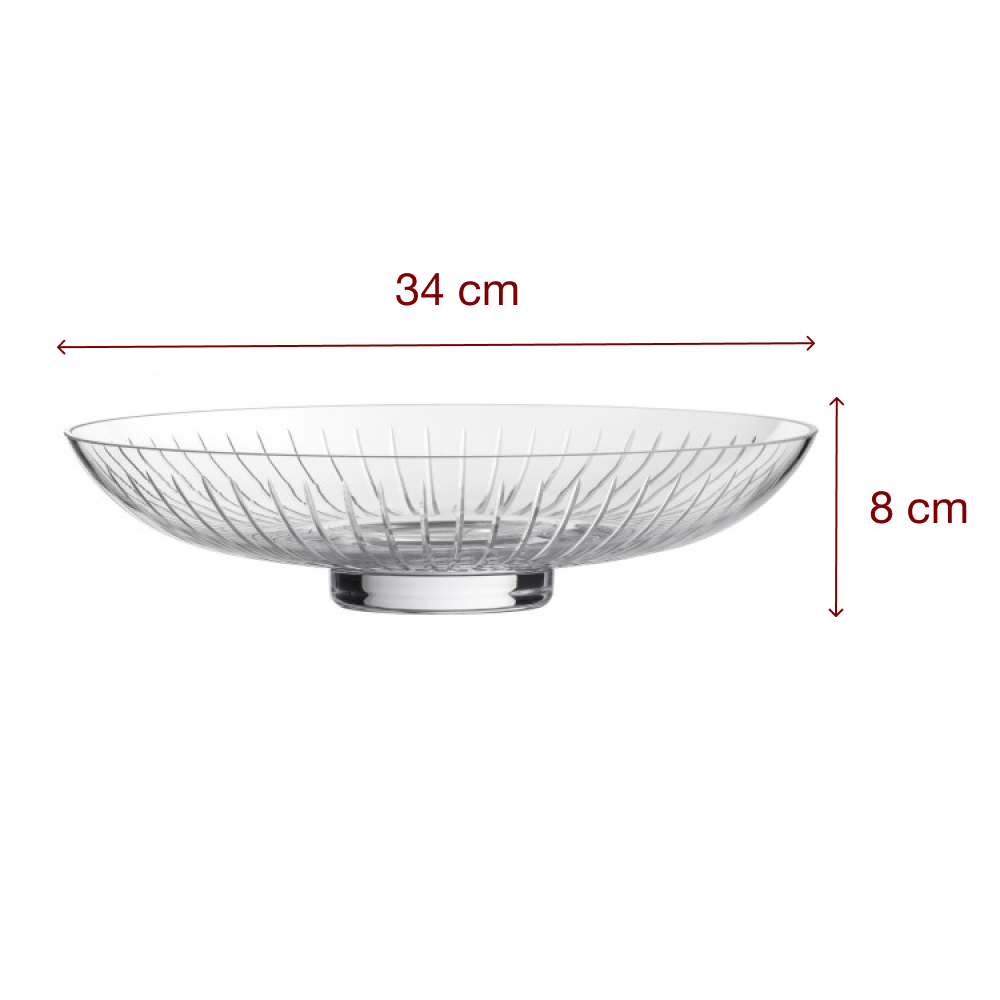 Đĩa pha lê Zwiesel Glas Signum có thiết kế sâu lòng, miệng đĩa tỏa rộng, đường kính 34 cm và chiều cao 8 cm. Bề mặt đĩa có các đường vân kẻ sọc đặc trưng của bộ sưu tập Signum, được chế tác thủ công từ chất liệu thủy tinh pha lê cao cấp.