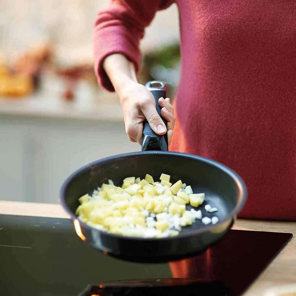 Tay cầm an toàn của chảo bảo vệ tay bạn khỏi nhiệt và được tạo hình công thái học để có cảm giác cầm nắm hoàn hảo. Tay cầm cũng có chức năng chốt.