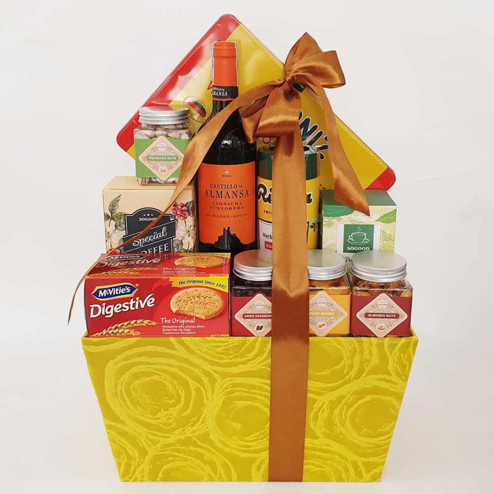 Giỏ Quà Tết Thịnh Vượng 1525 – Sắc Màu được thiết kế, trang trí bắt mắt, sang trọng biểu trung cho sự quý phái, cát tường. Giỏ quà bao gồm 11 sản phẩm nhập khẩu xịn xò, chất lượng khác nhau như: Rượu vang, bánh quy, kẹo gói, cà phê hộp, trà gói, các loại mứt sấy… kết hợp cùng nhau tạo lên một món quà đầy ý nghĩa, trang trọng dành tặng cho cán bộ công nhân viên doanh nghiệp, bạn bè, gia đình và người thân trong thời khắc năm mới sắp tới.