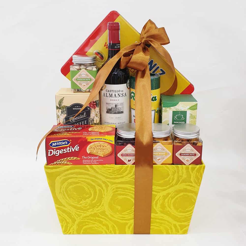 Giỏ Quà Tết Thịnh Vượng 1645 – Sắc Màu được thiết kế, trang trí bắt mắt, sang trọng biểu trung cho sự quý phái, cát tường. Giỏ quà bao gồm 11 sản phẩm nhập khẩu xịn xò, chất lượng khác nhau như: Rượu vang, bánh quy, kẹo gói, cà phê hộp, trà gói, các loại mứt sấy… kết hợp cùng nhau tạo lên một món quà đầy ý nghĩa, trang trọng dành tặng cho cán bộ công nhân viên doanh nghiệp, bạn bè, gia đình và người thân trong thời khắc năm mới sắp tới.