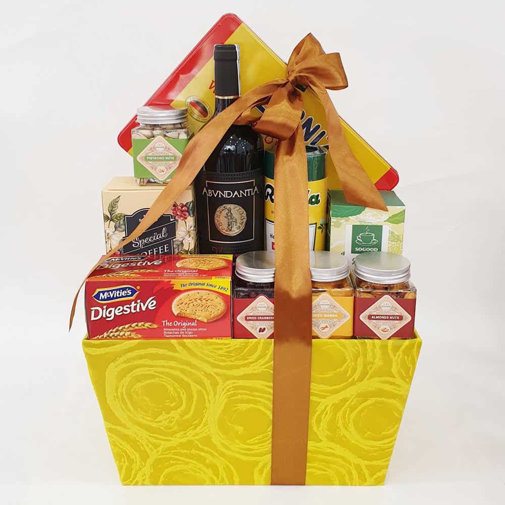 Giỏ Quà Tết Thịnh Vượng 1775 – Sắc Màu được thiết kế, trang trí bắt mắt, sang trọng biểu trung cho sự quý phái, cát tường. Giỏ quà bao gồm 11 sản phẩm nhập khẩu xịn xò, chất lượng khác nhau như: Rượu vang, bánh quy, kẹo gói, cà phê hộp, trà gói, các loại mứt sấy… kết hợp cùng nhau tạo lên một món quà đầy ý nghĩa, trang trọng dành tặng cho cán bộ công nhân viên doanh nghiệp, bạn bè, gia đình và người thân trong thời khắc năm mới sắp tới.