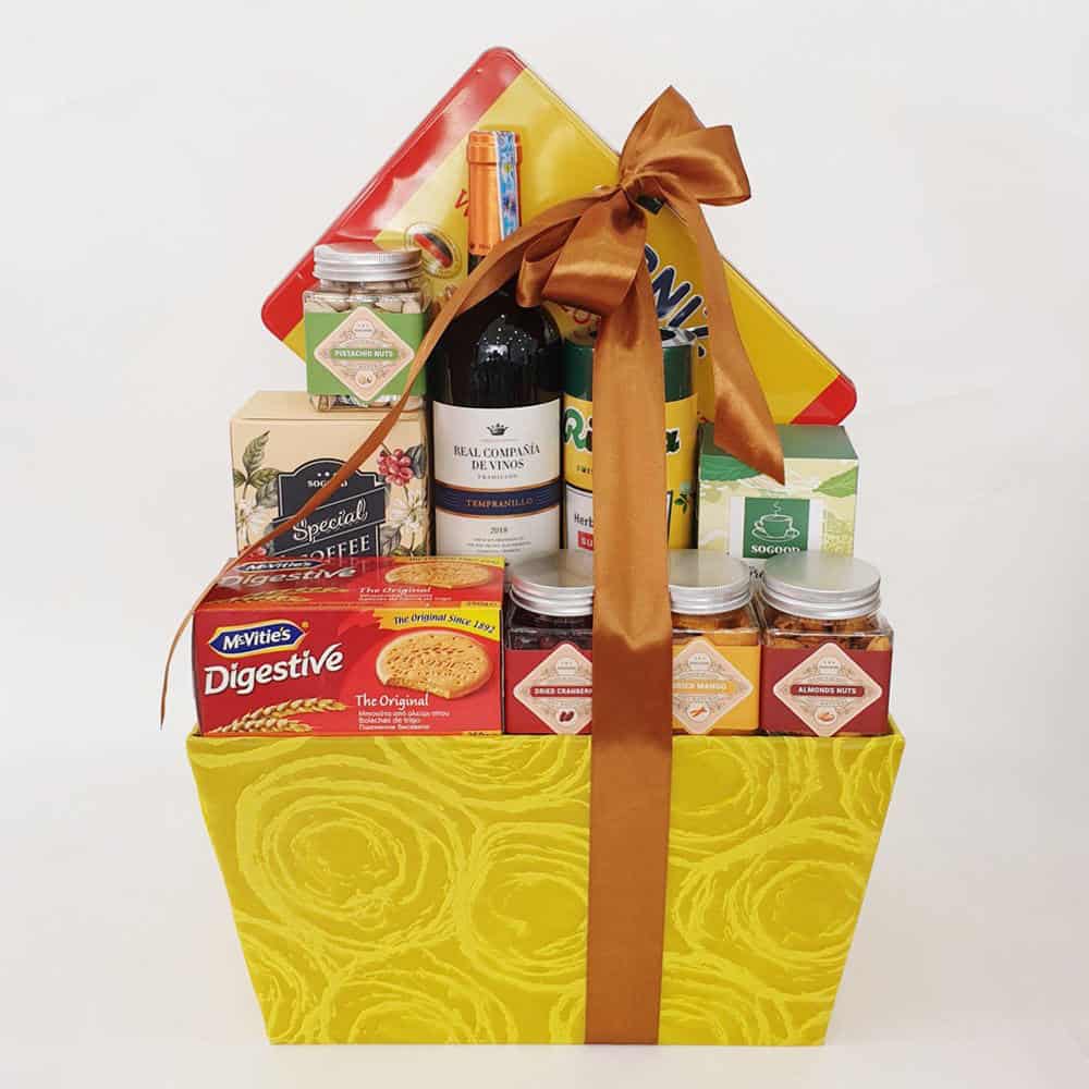 Giỏ Quà Tết Thịnh Vượng 1790 – Sắc Màu được thiết kế, trang trí bắt mắt, sang trọng biểu trung cho sự quý phái, cát tường. Giỏ quà bao gồm 12 sản phẩm nhập khẩu xịn xò, chất lượng khác nhau như: Rượu vang, bánh quy, kẹo gói, cà phê hộp, trà gói, các loại mứt sấy… kết hợp cùng nhau tạo lên một món quà đầy ý nghĩa, trang trọng dành tặng cho cán bộ công nhân viên doanh nghiệp, bạn bè, gia đình và người thân trong thời khắc năm mới sắp tới.