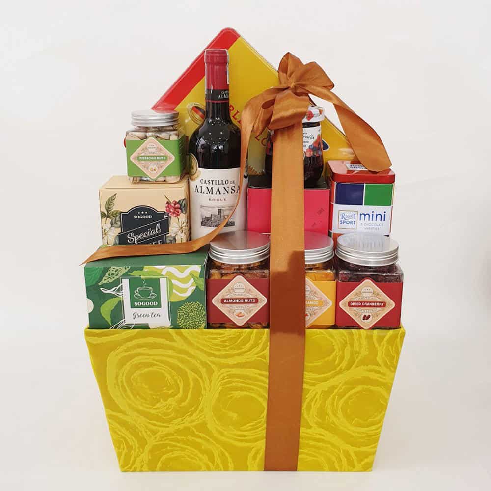 Giỏ Quà Tết Thịnh Vượng 2020 – Sắc Màu được thiết kế, trang trí bắt mắt, sang trọng biểu trung cho sự quý phái, cát tường. Giỏ quà bao gồm 12 sản phẩm nhập khẩu xịn xò, chất lượng khác nhau như: Rượu vang, bánh quy, kẹo gói, cà phê hộp, trà gói, các loại mứt sấy… kết hợp cùng nhau tạo lên một món quà đầy ý nghĩa, trang trọng dành tặng cho cán bộ công nhân viên doanh nghiệp, bạn bè, gia đình và người thân trong thời khắc năm mới sắp tới.