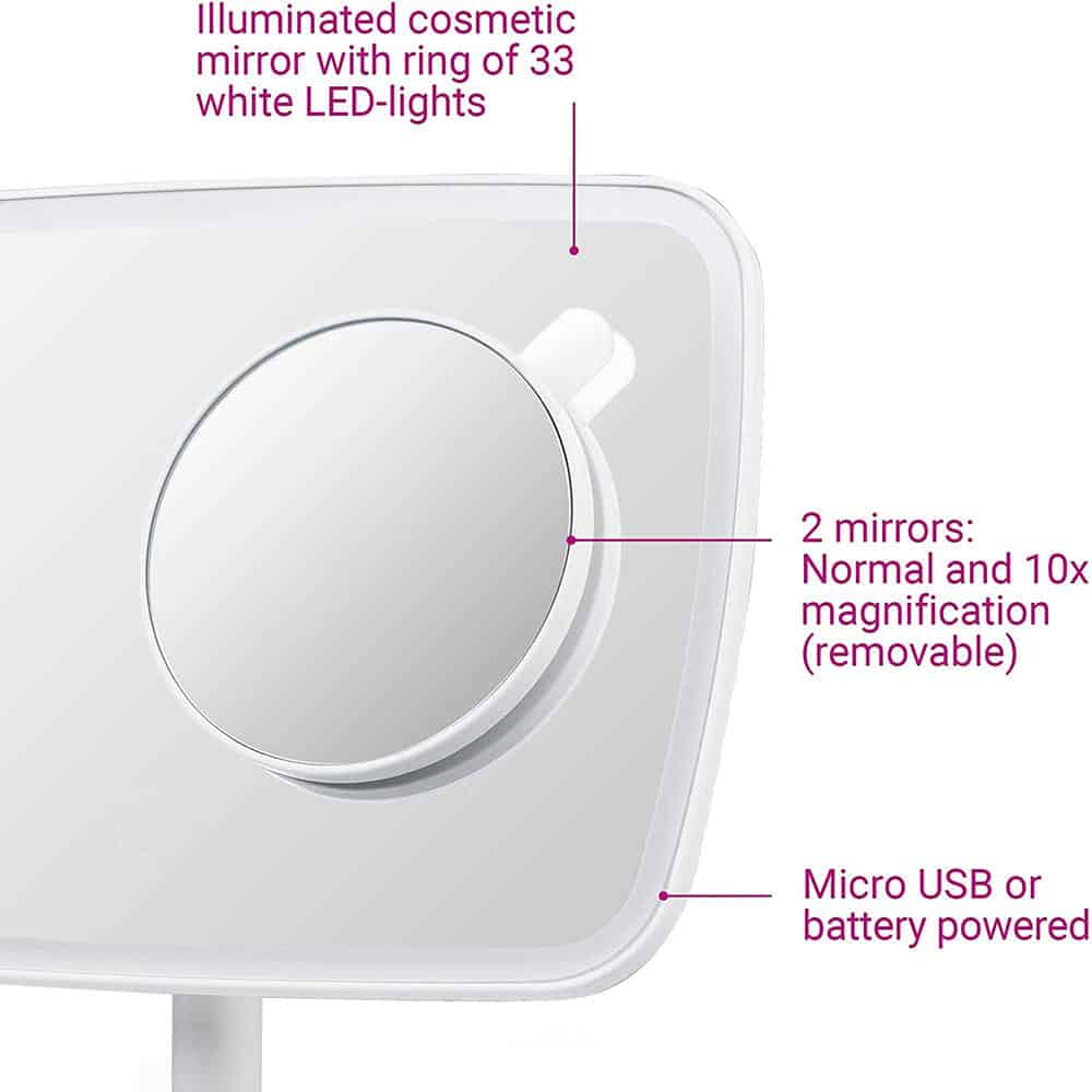 Gương Trang Điểm Medisana CM 848 được trang bị cơ chế hoạt động được bằng nguồn pin hoặc thông qua cổng Micro USB cực kỳ tiện lợi. Mặt sau của gương chính còn được thiết kế để cho phép cất giữ chiếc gương nhỏ giúp bạn dễ dàng sử dụng khi cần.