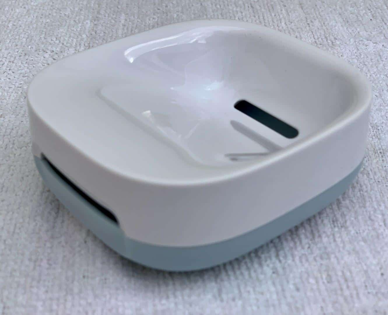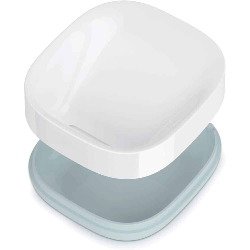 Hộp Đựng Xà Phòng thông thường rất khó giữ sạch và chiếm nhiều diện tích xung quanh bồn rửa. Thiết kế nhỏ gọn, thông minh này có đế góc cạnh. Nó cũng cho phép nước thừa và cặn xà phòng thoát ra khỏi tầm nhìn. Nó có lỗ thông gió ở phần trũng đựng xà bông để nước dư trên bánh sẽ lọt xuống dưới, đồng thời thiết kế thêm 1 cửa sổ thoáng khí ở bên hông giúp thoát hết hơi nước ở đáy nên sản phẩm luôn được khô ráo, đế chống trượt và có thể tháo rời để vệ sinh dễ dàng. Vệ sinh và làm khô bằng tay.