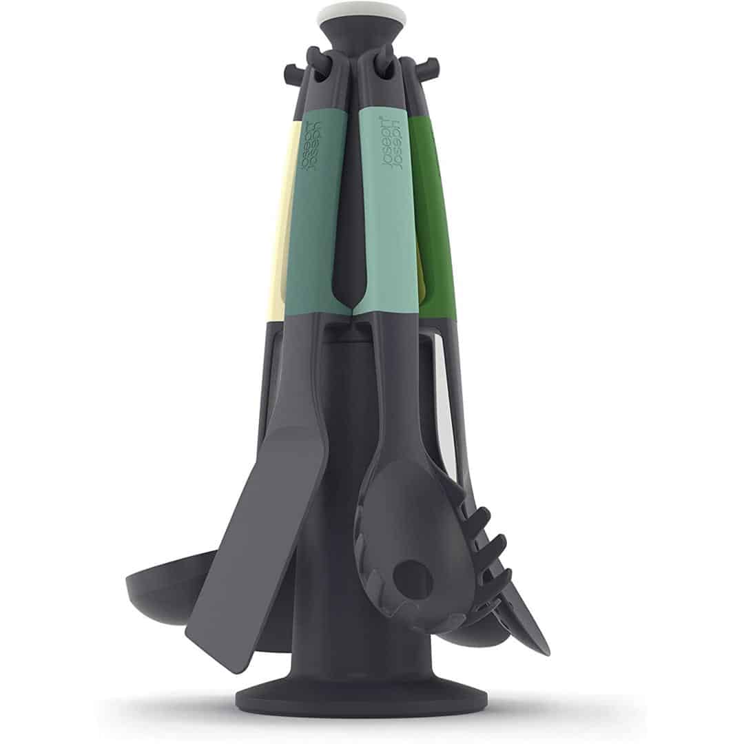 - Bộ Dụng Cụ Nấu Ăn 6 Món Joseph Joseph 1041 Elevate được thiết kế để cải thiện vệ sinh và giảm bớt sự lộn xộn. Tay cầm có trọng lượng và giá đỡ dụng cụ tích hợp ngăn không cho đầu dụng cụ chạm vào mặt bàn khi đặt xuống