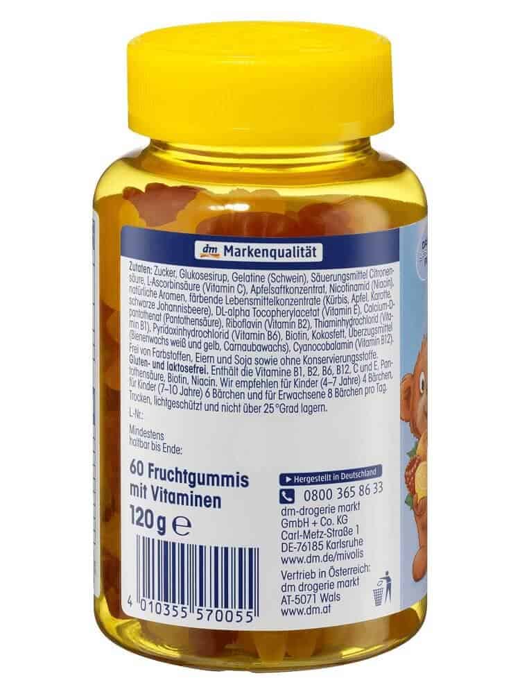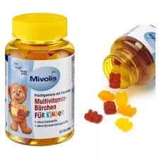 Gấu đa vitamin Mivolis cho trẻ em là loại kẹo cao su thơm ngon có chứa nhiều loại vitamin khác nhau. Chứa vitamin B1, Thiamin, B2, B6, B12, Riboflavin, Vitamin C, Vitamin E, Biotin, Niacin, axit pantothenic, chiết xuất có đặc tư bí đỏ, cà rốt, nho đen, siro gluco,…