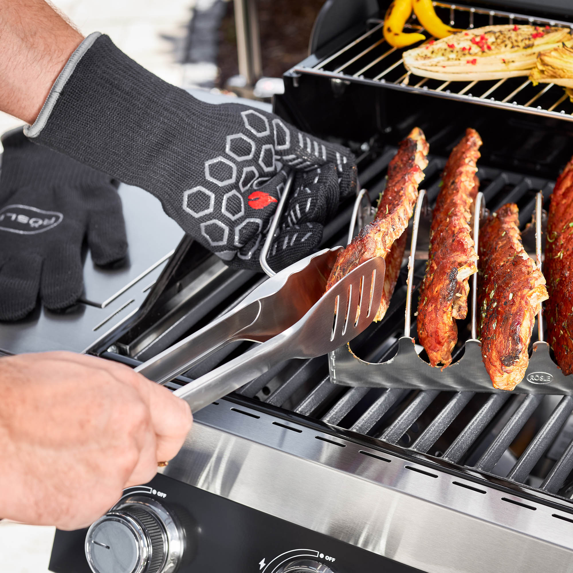 Kẹp gắp Roesle 25243 44cm với bề mặt xoay lớn giúp lật thịt, cá và rau củ dễ dàng và chính xác. Đầu kẹp phía trên cũng có thể được sử dụng để múc các món ăn phụ nhỏ hơn, đầu kẹp dưới được trang bị các rãnh thoát dầu mỡ. Với chất liệu thép không gỉ nên bạn dễ dàng làm sạch và vệ sinh kẹp gắp Roesle 25243 dưới vòi nước chảy và vệ sinh an toàn trong máy rửa bát.