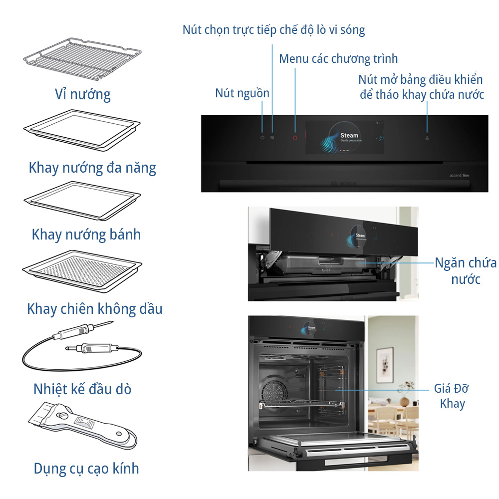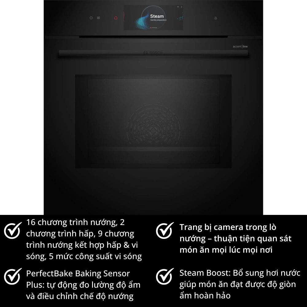 | Tiện ích | Công suất vi sóng tối đa: 800W Màn hình cảm ứng TFT Camera tích hợp ngay trong lò Cảm biến PerfectBake Baking Sensor Plus Nhiệt kế đầu dò PerfectRoast Plus Chức năng Crisp Chức năng Assist |