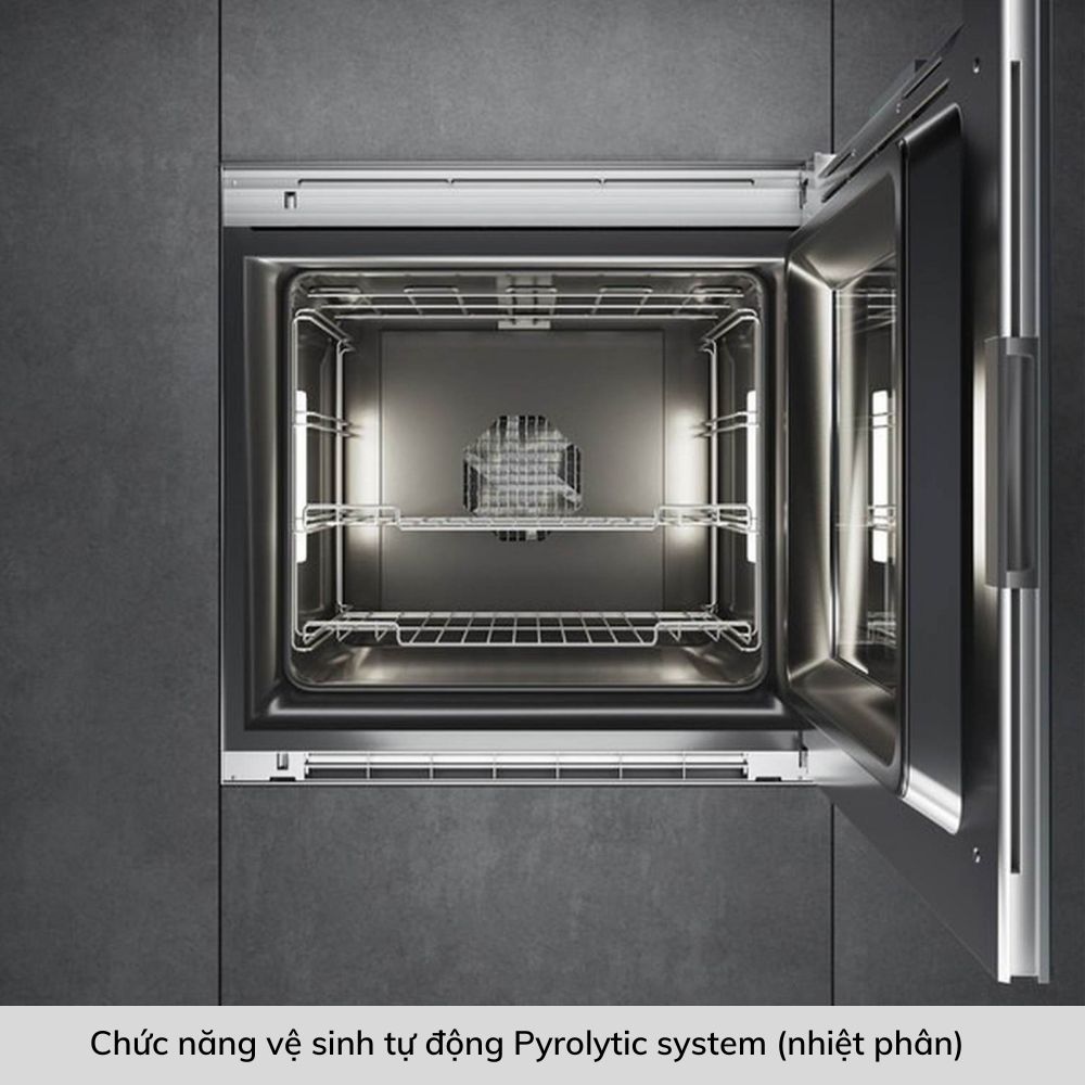 Một điểm đáng chú ý là chức năng vệ sinh tự động Pyrolytic system (nhiệt phân), giúp lò nướng Gaggenau BOP251102 tự vệ sinh bằng cách làm nóng lên đến 485 độ C để biến các cặn bẩn thành tro khô, từ đó dễ dàng vệ sinh lò một cách hiệu quả. Điều này giúp duy trì sự sạch sẽ và an toàn cho lò nướng.
