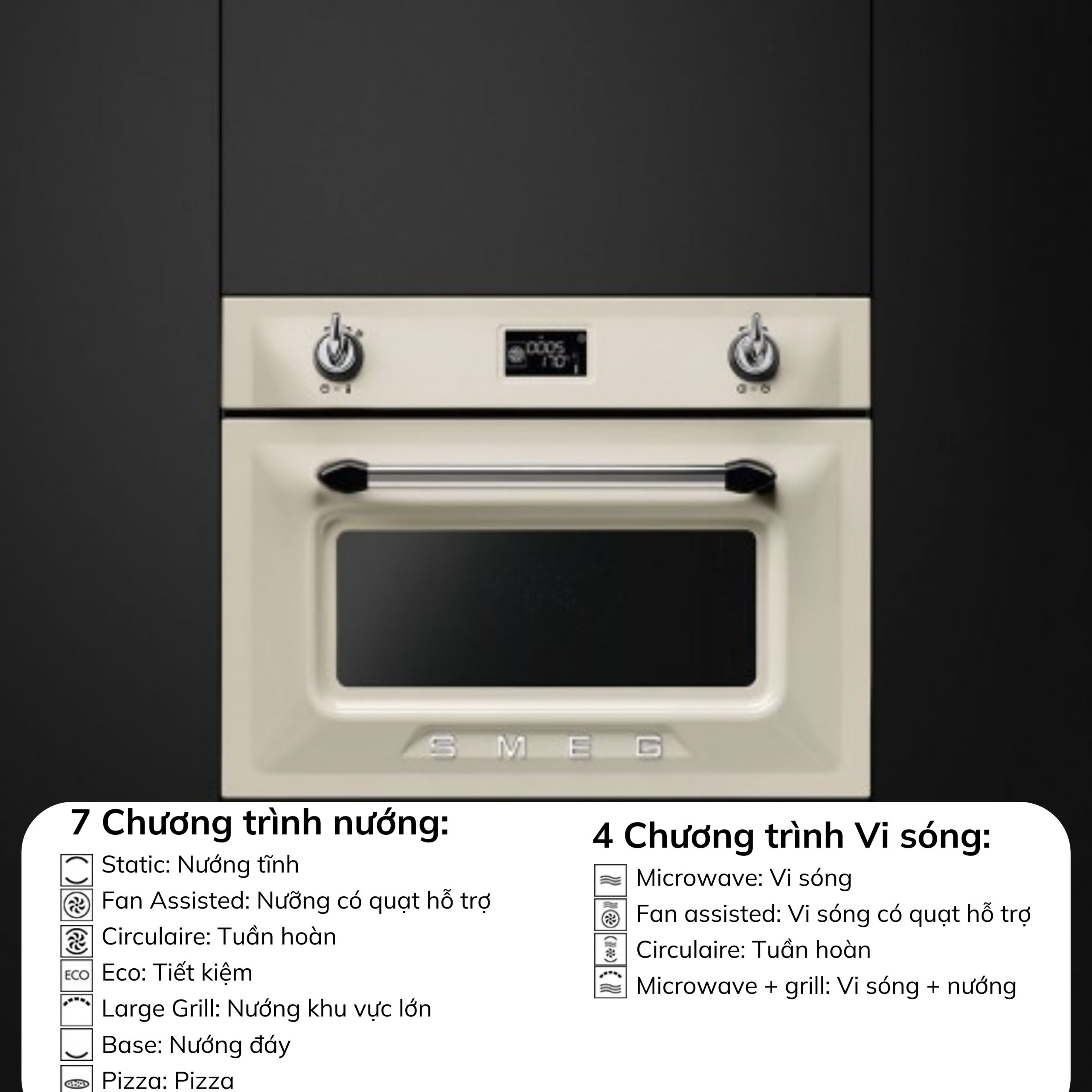Lò nướng kèm vi sóng SMEG Victoria SO4902M1 là một sự kết hợp hoàn hảo giữa thiết kế tinh tế và công nghệ hiện đại, mang đậm chất Ý với gam màu Kem sang trọng và thiết kế âm tủ tinh tế. Sản phẩm không chỉ làm nổi bật không gian bếp của bạn mà còn đáp ứng đầy đủ các nhu cầu nấu nướng đa dạng với 11 chương trình nấu, bao gồm cả chức năng nướng và vi sóng. Việc vệ sinh lò trở nên dễ dàng hơn bao giờ hết nhờ lớp phủ Ever Clean và chức năng làm sạch bằng hơi nước tiện dụng. Bên cạnh đó, SMEG Victoria SO4902M1 còn tích hợp hàng loạt tính năng tiện lợi khác, mang lại trải nghiệm nấu nướng hoàn hảo cho gia đình bạn.