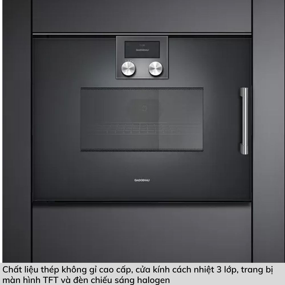 Lò vi sóng kết hợp nướng Gaggenau BMP251100 được làm từ chất liệu chất lượng cao như thép không gỉ, giúp sản phẩm có độ bền và tính ổn định cao. Chất liệu này cũng giúp dễ dàng vệ sinh và bảo quản sản phẩm. Cửa kính cách nhiệt 3 lớp, khả năng mở cửa tới 110 độ giúp bạn quan sát quá trình nấu nướng mà không cần mở cửa, tiết kiệm nhiệt và năng lượng.