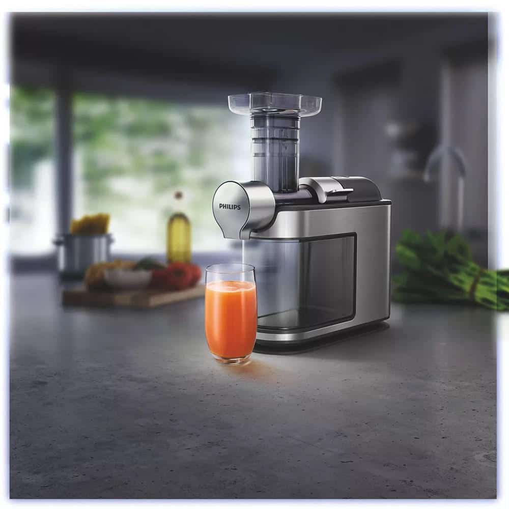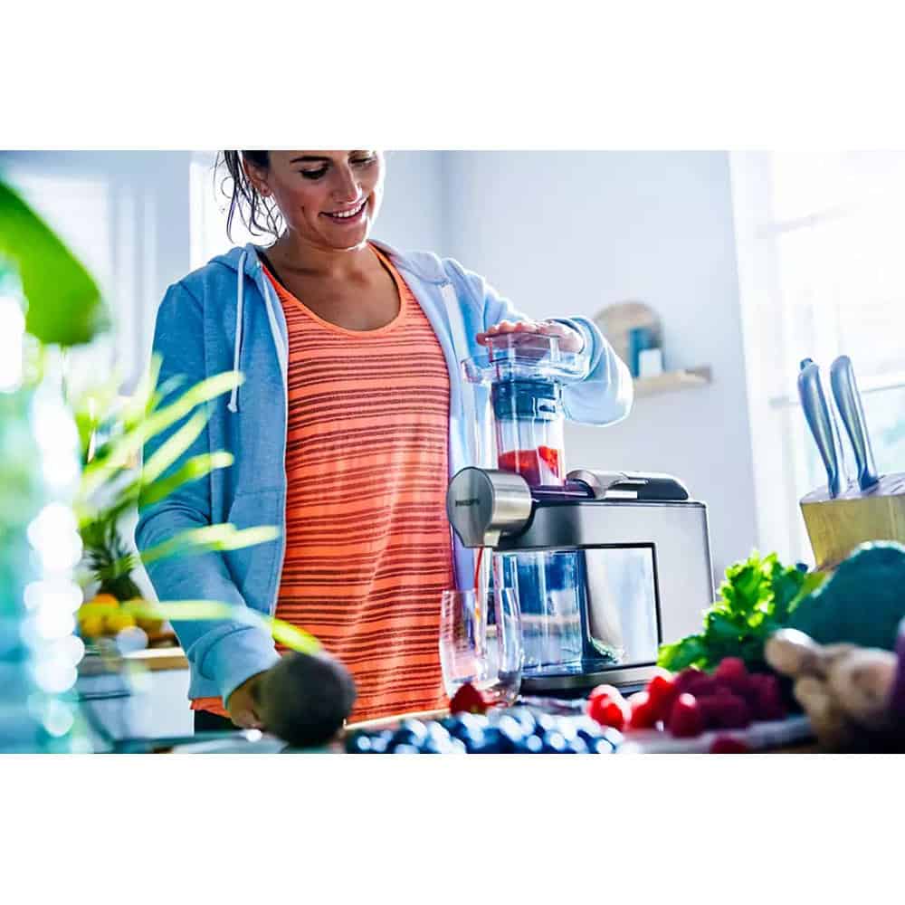 Công nghệ MicroMasticating cải tiến của Philips đảm bảo rằng các tế bào của rau và trái cây được chiết tách tối đa . Giờ đây, tiết kiệm thời gian trong quá trình chuẩn bị nhờ vào lỗ chiết rót lớn. Sau khi ép, tất cả các bộ phận có thể được làm sạch dưới vòi nước.