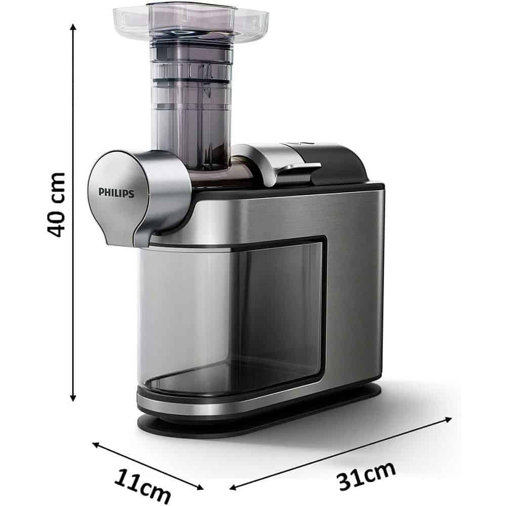 Nhờ thiết kế tối ưu với chiều rộng chỉ 11 cm, máy ép trái cây luôn sẵn sàng để sử dụng trên bề mặt làm việc của bạn. Có rất ít không gian lưu trữ hoặc không gian cần thiết để sử dụng máy ép trái cây và nó có thể dễ dàng chứa trong nhà bếp của bạn mà không cần thêm ngăn.