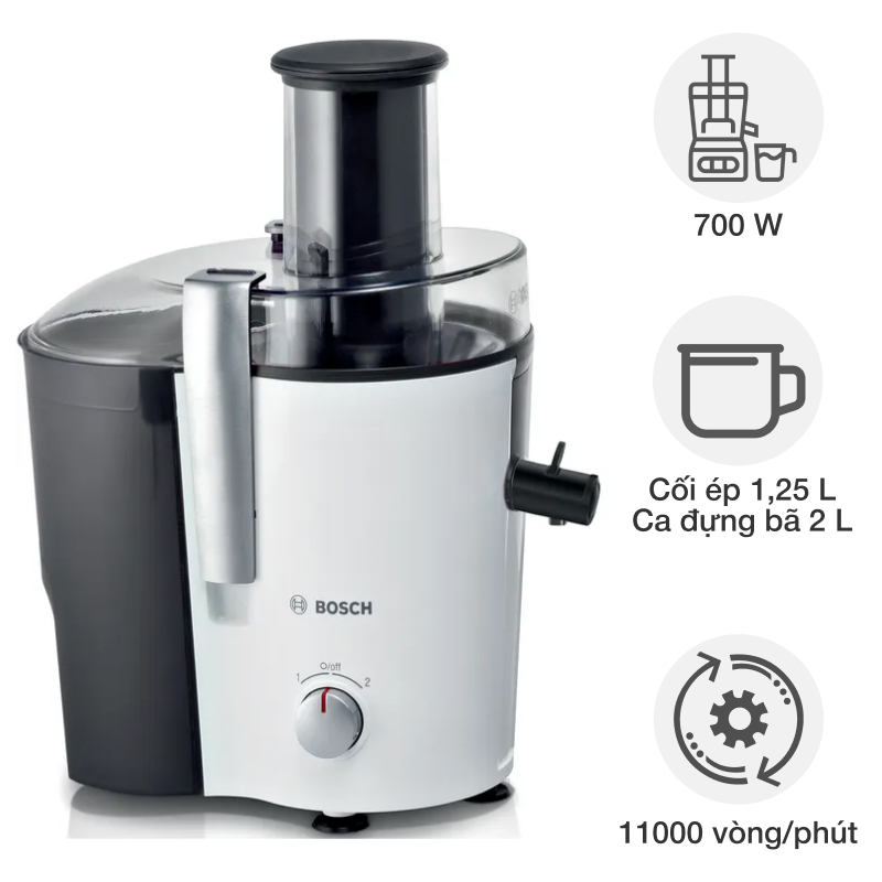 Máy ép trái cây Bosch MES25 VitaJuice hoạt động mạnh mẽ với công suất 700 W và tốc độ quay 11.000 vòng/phút. Thiết kế ống tiếp nguyên liệu rộng Ø 7,3 cm giúp ép nguyên trái dễ dàng, tiết kiệm thời gian. Máy có 2 mức tốc độ, phù hợp cho cả trái cây mềm và cứng.