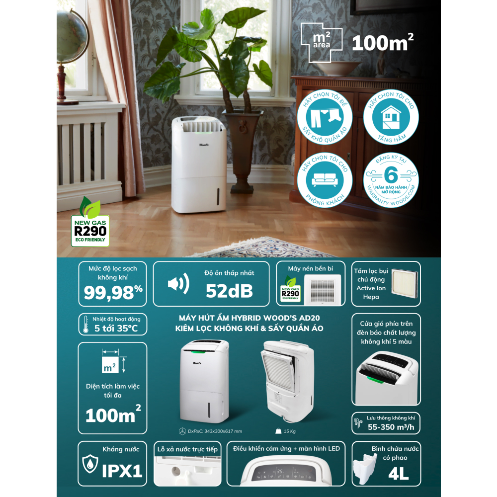 Một số đặc điểm nổi bật của Máy hút ẩm kèm lọc không khí Wood’s AD20G