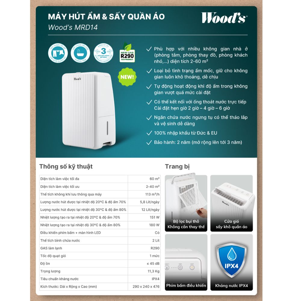 Thông số kỹ thuật và tổng quan máy hút ẩm Wood’s MRD14