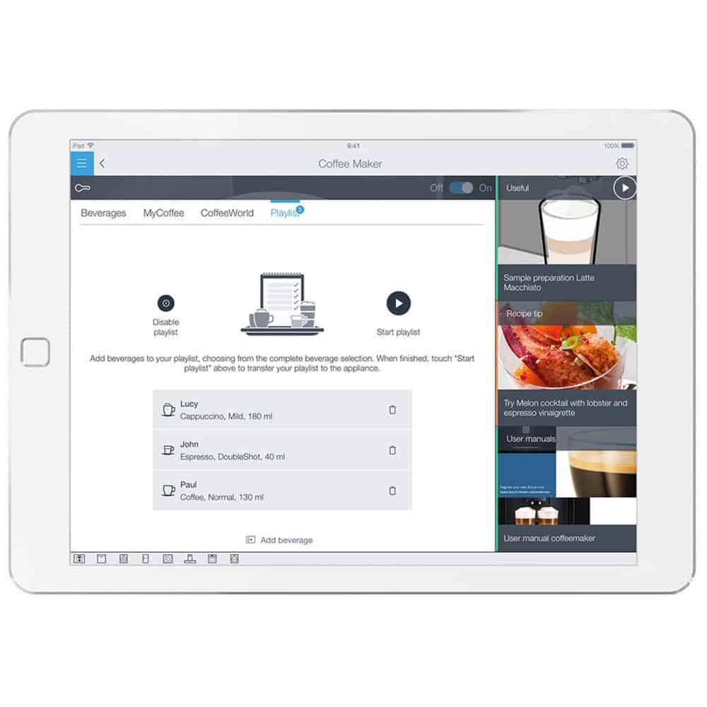 Thường thì chúng ta phải dành thời gian để tiếp đãi khách của mình thay vì nói chuyện với họ. Với chức năng CoffeePlaylist trong ứng dụng Home Connect, bạn có thể chỉ cần để máy pha cà phê thực hiện các công việc pha chế. Chỉ cần chọn chế độ cà phê mà khách thích trong ứng dụng Home Connect trên thiết bị di động của bạn. Máy pha CoffeePlaylist của bạn sẽ sẵn lòng đáp ứng mọi nhu cầu của bạn. Bạn chỉ cần đảm bảo rằng luôn đặt một cái cốc dưới vòi. Đây là cách bạn sử dụng máy của mình và đồng thời tận hưởng sự đồng hành tốt.