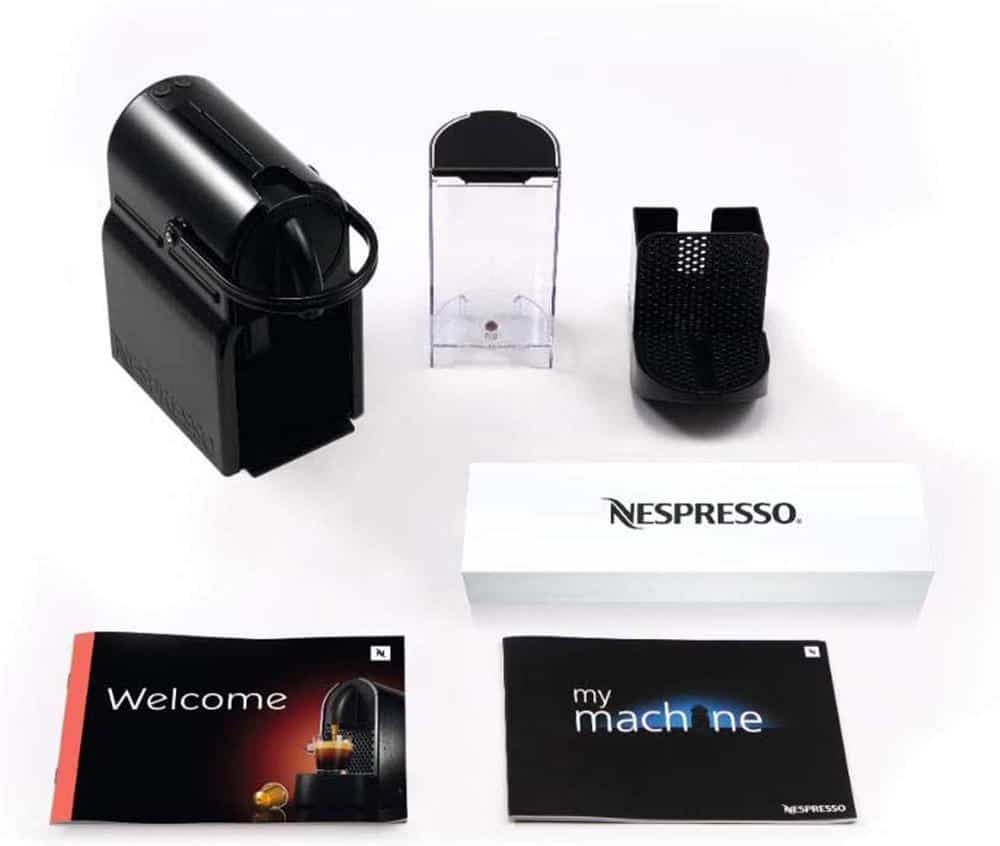 Phụ kiện đi kèm của Máy Pha Cà Phê Viên Nén Delonghi Nespresso Inissia EN 80.B đa dạng: Sách hướng dẫn sử dụng, sách công thức coffee, hộp 6 viên nén coffee với hương vị khác nhau, khay kê cốc thấp. Ngoài ra còn có bình đựng nước sau máy, khay đựng bã viên nén.