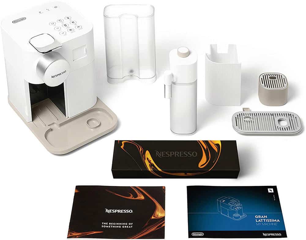 Máy Pha Cafe Delonghi Nespresso Gran Lattissima EN 650.W với lượng phụ kiện đi kèm rất đầy đủ và tiện nghi: sách hướng dẫn sử dụng, sách công thức coffee, hộp 10 viên nén coffee với hương vị khác nhau, khay kê cốc thấp ngoài ra còn có bình đựng nước sau máy, bình đựng sữa đánh sữa, khay đựng bã viên nén.