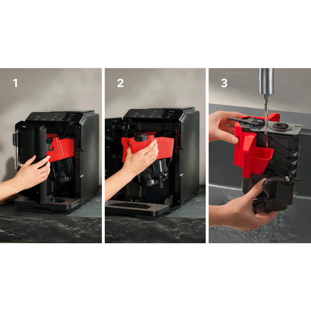 Ngoài ra, máy còn được trang bị chương trình làm sạch và tẩy cặn tự động, giúp duy trì hiệu suất hoạt động và kéo dài tuổi thọ của máy. Quá trình này đảm bảo các bộ phận bên trong luôn sạch sẽ, ngăn ngừa tích tụ cặn bẩn và đảm bảo chất lượng cà phê tốt nhất qua mỗi lần pha.