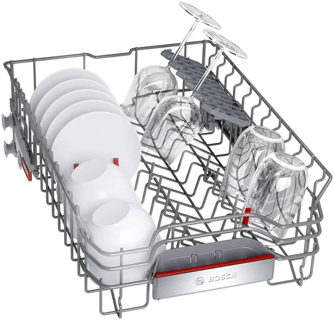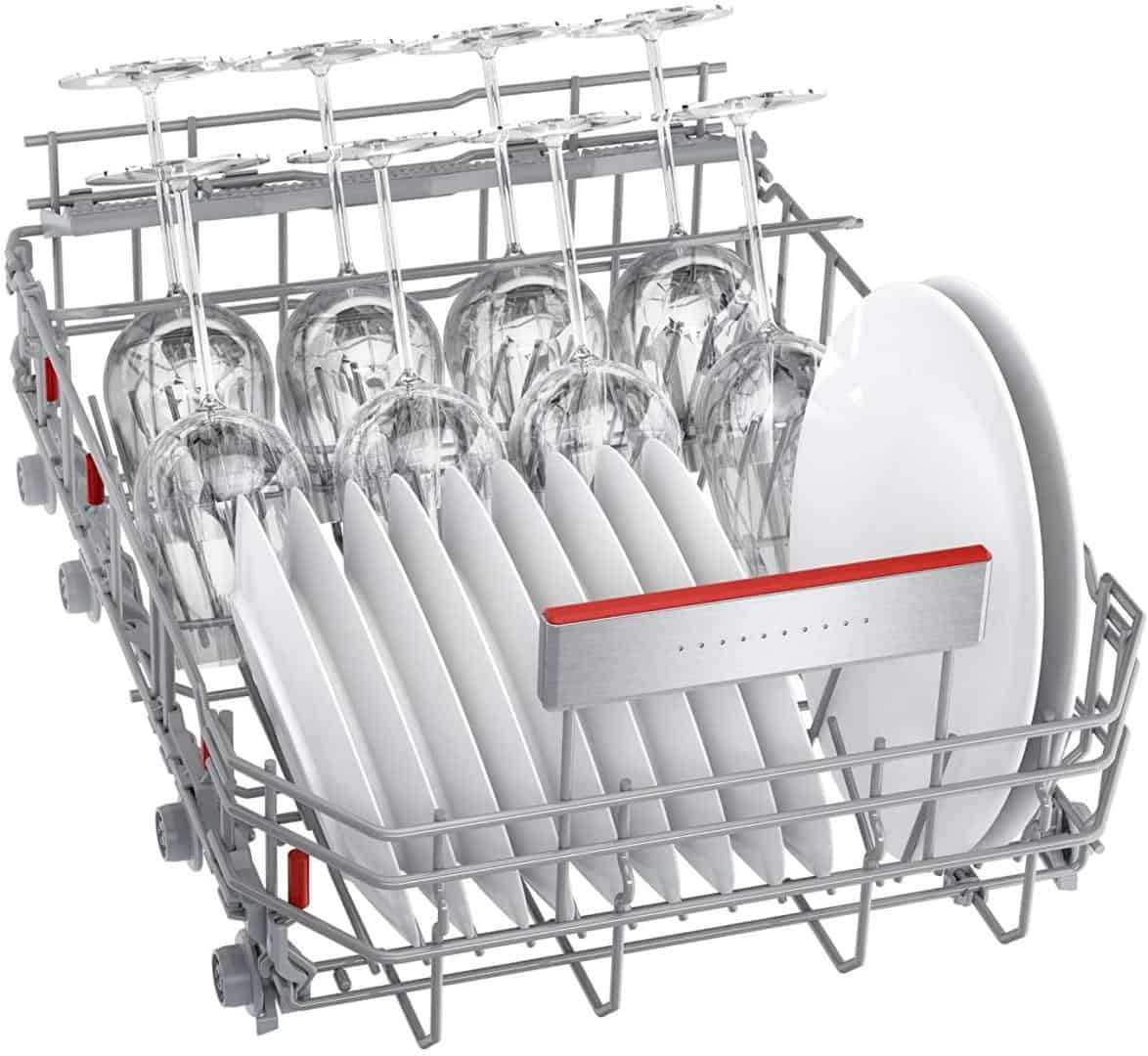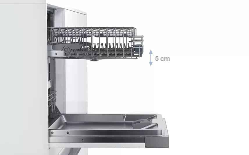 Nhờ hệ thống giá đỡ 3 chiều, giỏ trên có thể được điều chỉnh độ cao tổng cộng 5 cm bằng một tay cầm. Và thậm chí được tải đầy đủ. Dù là đĩa pizza hay ly có thân dài – nhiều khoảng trống hơn được tạo ra một cách linh hoạt ở trên hoặc dưới để rửa các đồ cao.