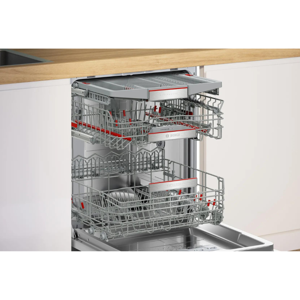Không gian bên trong máy rửa chén Bosch Series 8 SMD8TCX00D được thiết kế 3 giàn rửa có thể rửa được xoong nồi, dao kéo, ly,…