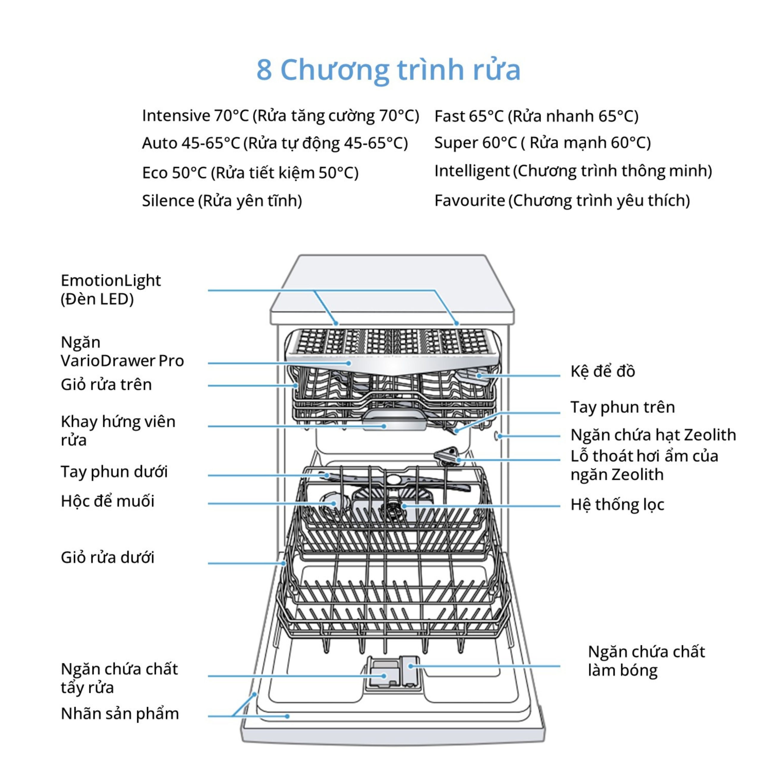 | Chương trình rửa | – Intensive 70°C (Rửa tăng cường 70°C) – Auto 45-65°C (Rửa tự động 45-65°C) – Eco 50°C (Rửa tiết kiệm 50°C) – Silence (Rửa yên lặng) – Fast 65°C (Rửa nhanh 65°C) – Intelligent (Chương trình thông minh) – Super 60°C ( Rửa mạnh 60°C) – Favourite (Chương trình yêu thích) |