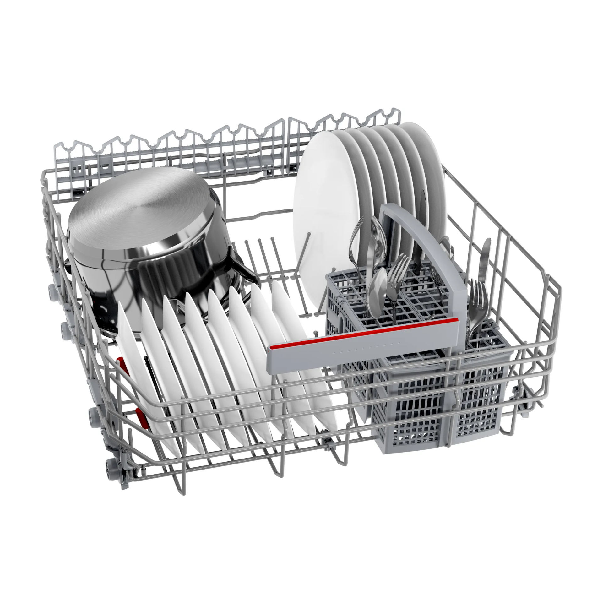 - Giàn dưới: Giàn dưới thường được sử dụng để chứa và làm sạch các đồ dùng lớn như xoong, nồi, chảo hay khay nướng hoặc thớt,…Ngoài ra, Bosch còn bổ sung thêm một giỏ rửa dao thìa dĩa ở giàn rửa dưới, tăng dung tích rửa cho máy rửa chén Bosch SMS6ZCI37Q.
