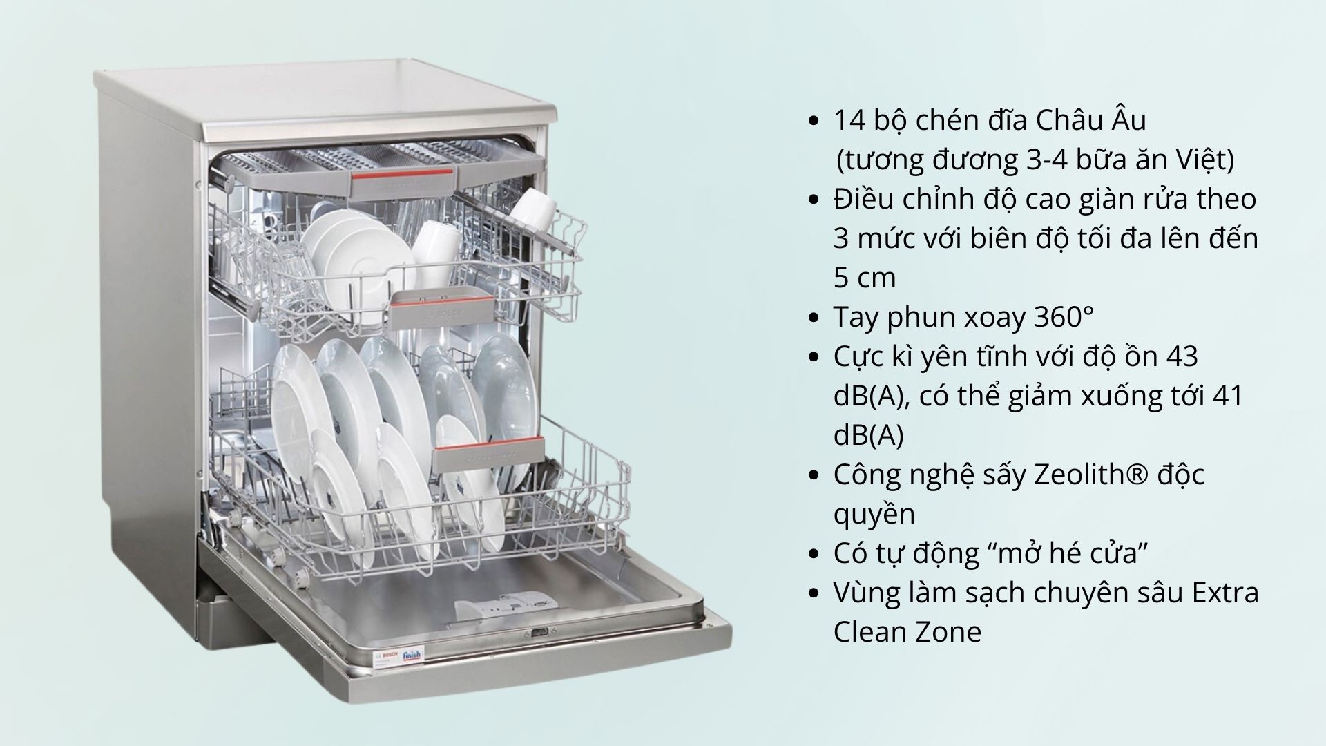 - Công nghệ sấy Zeolith® tiên tiến giúp sấy khô hoàn toàn chén bát, đảm bảo không còn mùi hôi.