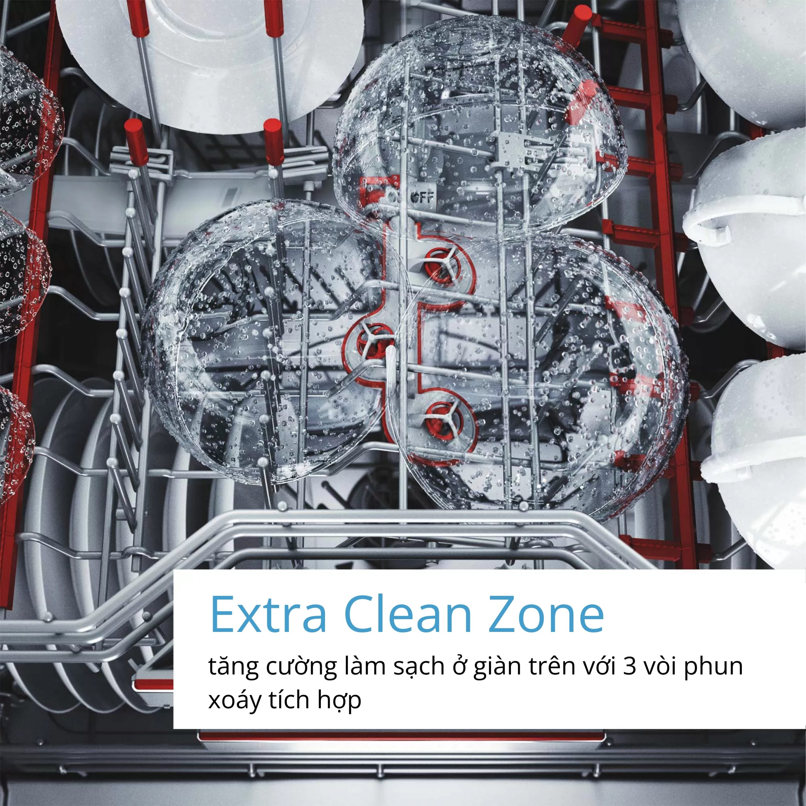 Tính năng Extra Clean Zone được tích hợp trên giàn rửa thứ 2 với 3 đầu phun tia nước áp lực cao giúp loại bỏ mọi vết bẩn cứng đầu trên chén dĩa một cách hiệu quả. Mỗi giỏ rửa cũng được trang bị các thanh đỡ phụ linh hoạt, đảm bảo sự ổn định và dễ dàng sử dụng cho nhiều loại vật dụng khác nhau như chén, dĩa, nồi, ly,….
