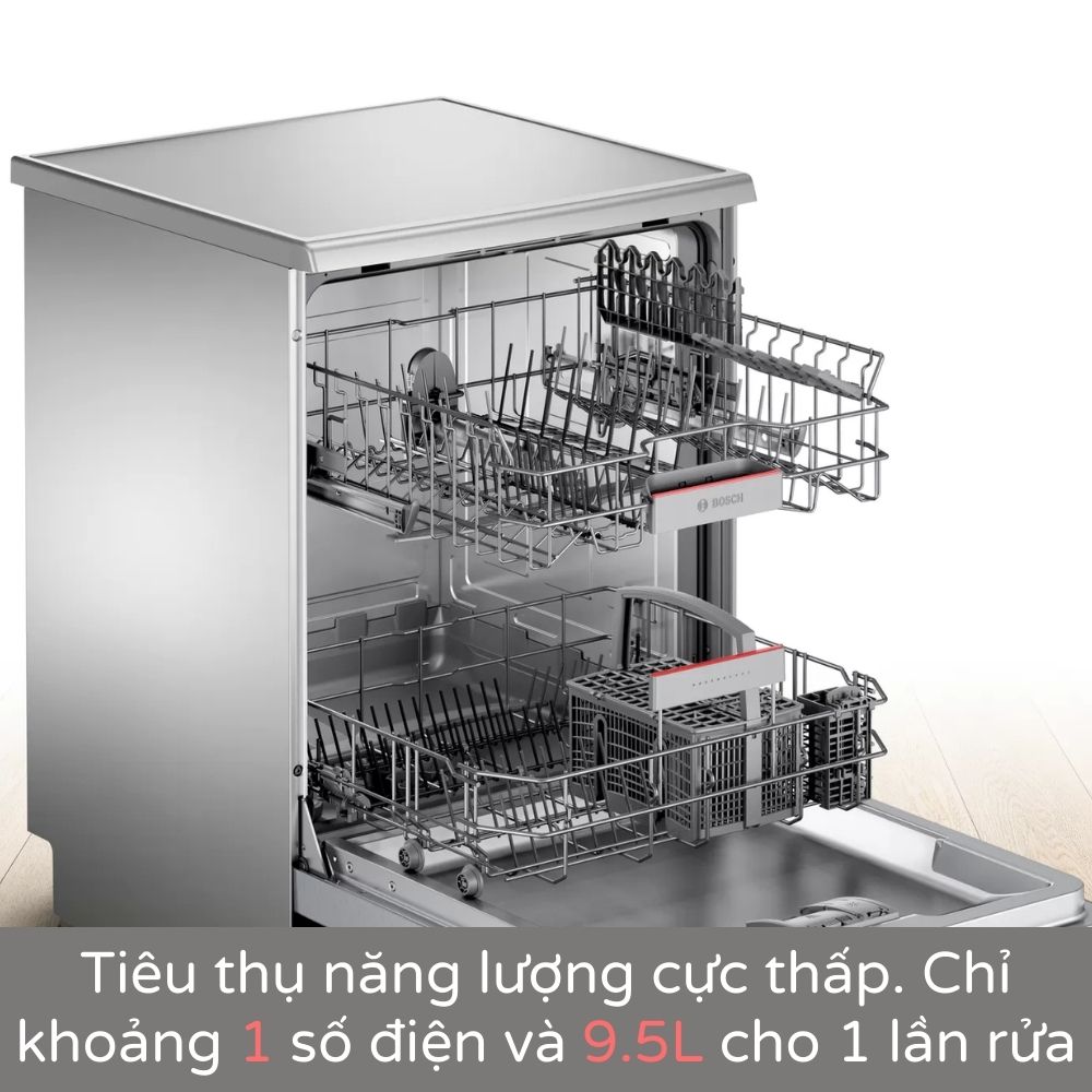 Mọi người thường cho rằng việc vận hành một chiếc máy rửa bát đồ sộ sẽ tốn rất nhiều nước và điện. Tuy nhiên, thực tế lại hoàn toàn khác biệt với các sản phẩm của Bosch. Máy Rửa Chén Độc Lập Bosch SMS46GI01P chỉ sử dụng 9.5 lít nước và khoảng 1 số điện cho mỗi lần rửa bát đĩa. Bạn hãy tưởng tượng 12 bộ đồ ăn châu Âu (tương đương với khoảng 3,4 bữa ăn của người Việt) có thể được rửa sạch bong, và khô ráo chỉ với mức tiêu thụ năng lượng khiêm tốn như vậy.