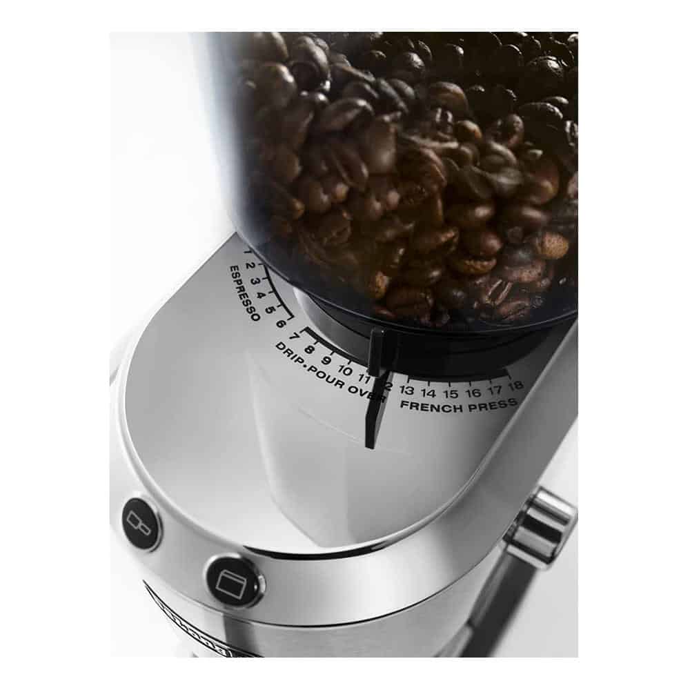 Máy Xay Hạt Cà Phê DeLonghi KG520.M bằng thép không gỉ có sức chứa 350 gram hạt, bạn có thể xay mịn hoặc thô.