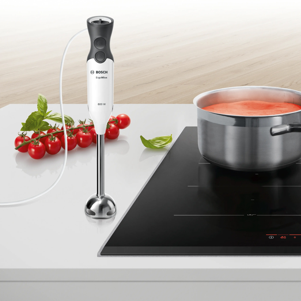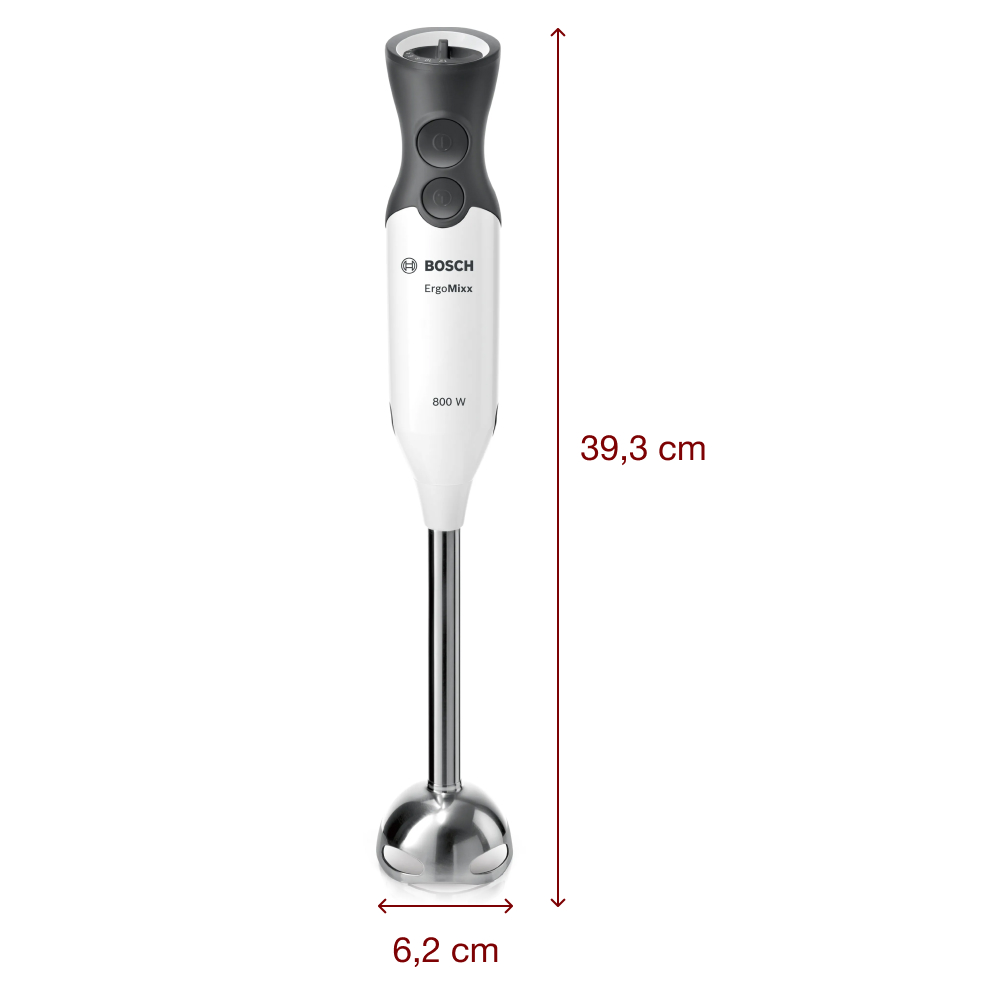 Máy xay sinh tố cầm tay Bosch MS61A4110 có kiểu dáng tinh giản, gọn gàng, tay cầm thiết kế công thái học mềm mại cho người dùng cầm nắm thoải mái và thao tác linh hoạt.
