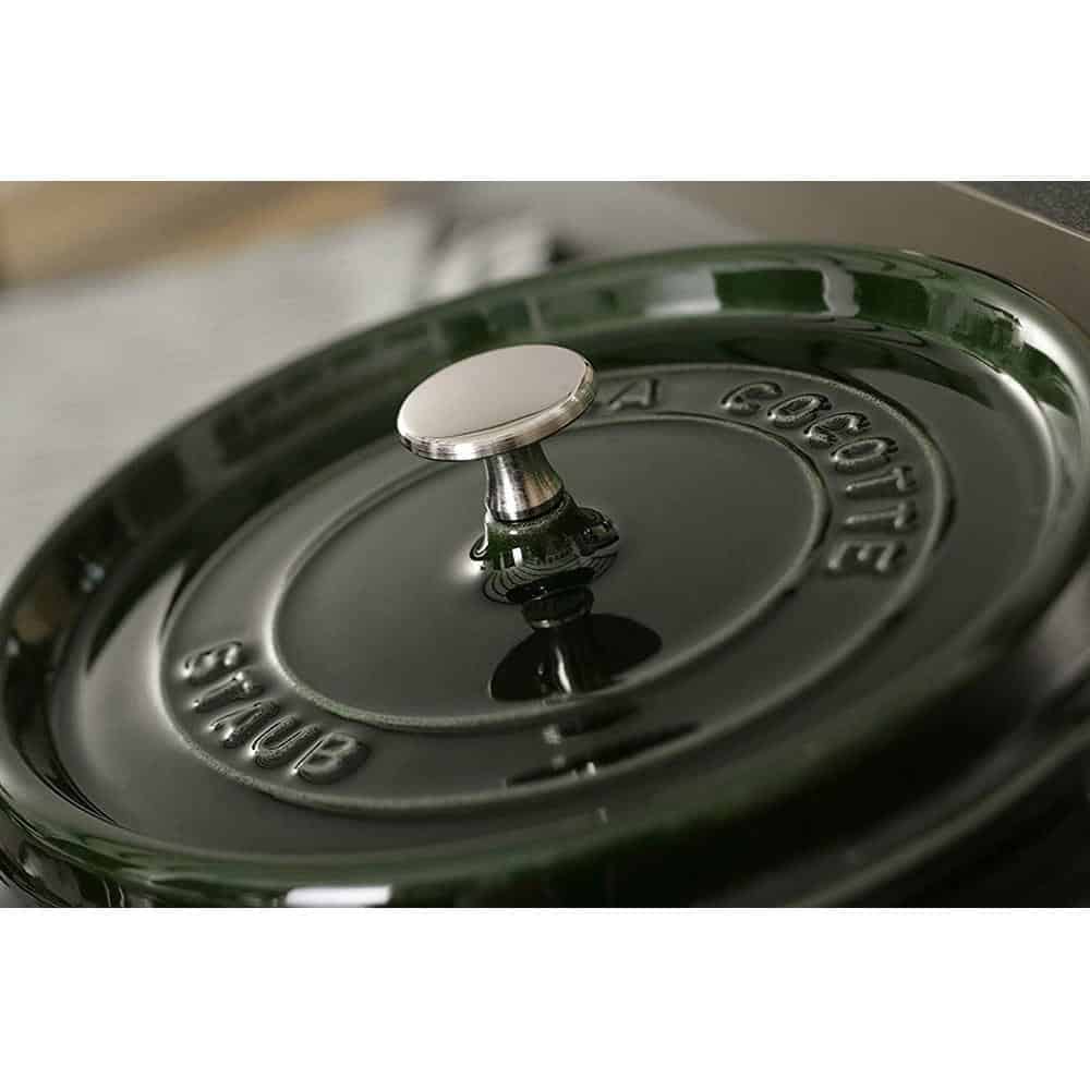 Nồi Gang Staub La Cocotte Green 22cm được thiết kế với nắp nồi kín với thân nồi kết hợp với thiết kế các gai trên nắp, giúp ngưng tụ hơi nước và tạo thành hiệu ứng giọt mưa giúp giữ được độ ẩm và giữ được hương vị cho món ăn. Điều này sẽ giúp cho việc chế biến các món ăn theo kiểu hầm, om sẽ hoàn hảo hơn. Ngoài ra, núm vặn trên nắp Nồi Gang Staub La Cocotte Green 22cm cũng được thiết kế để chịu được nhiệt độ cao lên đến 250 ℃. Hình dáng và chiều cao của núm vặn trên nắp nồi cũng được thiết kế phù hợp cho việc cầm nắm ngay cả khi chúng ta sử dụng với găng tay cách nhiệt sử dụng trong lò nướng.