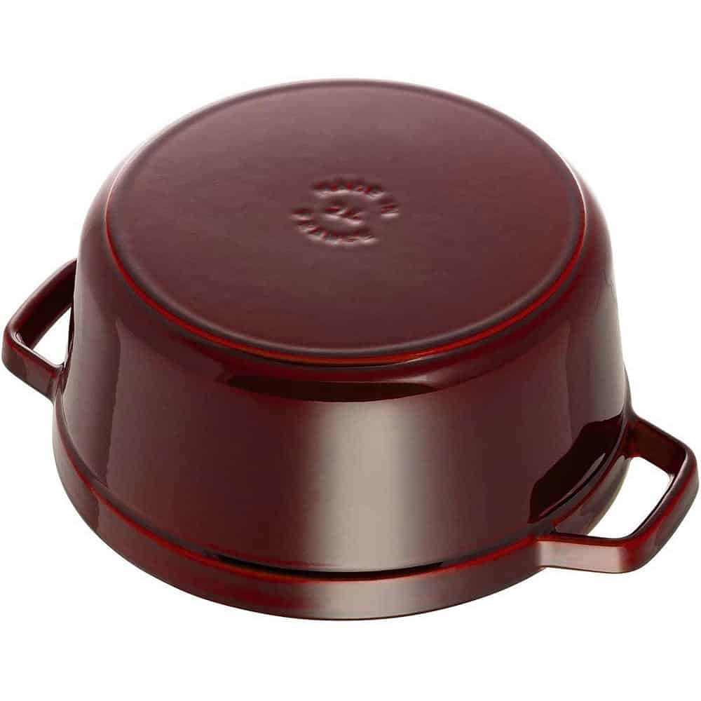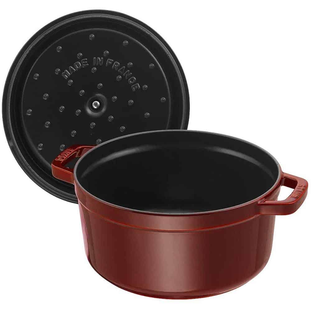 Nồi Gang Staub La Cocotte Grenadine Red 22c được thiết kế với nắp nồi kín với thân nồi kết hợp với thiết kế các gai trên nắp, giúp ngưng tụ hơi nước và tạo thành hiệu ứng giọt mưa giúp giữ được độ ẩm và giữ được hương vị cho món ăn. Điều này sẽ giúp cho việc chế biến các món ăn theo kiểu hầm, om sẽ hoàn hảo hơn. Ngoài ra, núm vặn trên nắp Nồi Gang Staub La Cocotte Grenadine Red 22cm cũng được thiết kế để chịu được nhiệt độ cao lên đến 250 ℃. Hình dáng và chiều cao của núm vặn trên nắp nồi cũng được thiết kế phù hợp cho việc cầm nắm ngay cả khi chúng ta sử dụng với găng tay cách nhiệt sử dụng trong lò nướng.